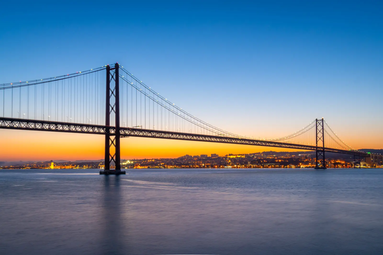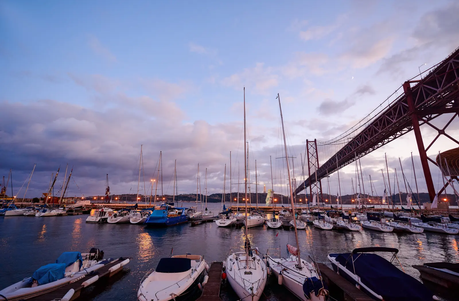 At sunset, the whole scene transforms. The bridge becomes a glowing silhouette against skies of gold, apricot, and violet. During blue hour, its lights shimmer across the river in long, dreamy reflections. Each angle tells a different story: one of engineering brilliance, one of maritime soul, and one of Lisbon simply being Lisbon – peaceful, poetic, and endlessly captivating.
