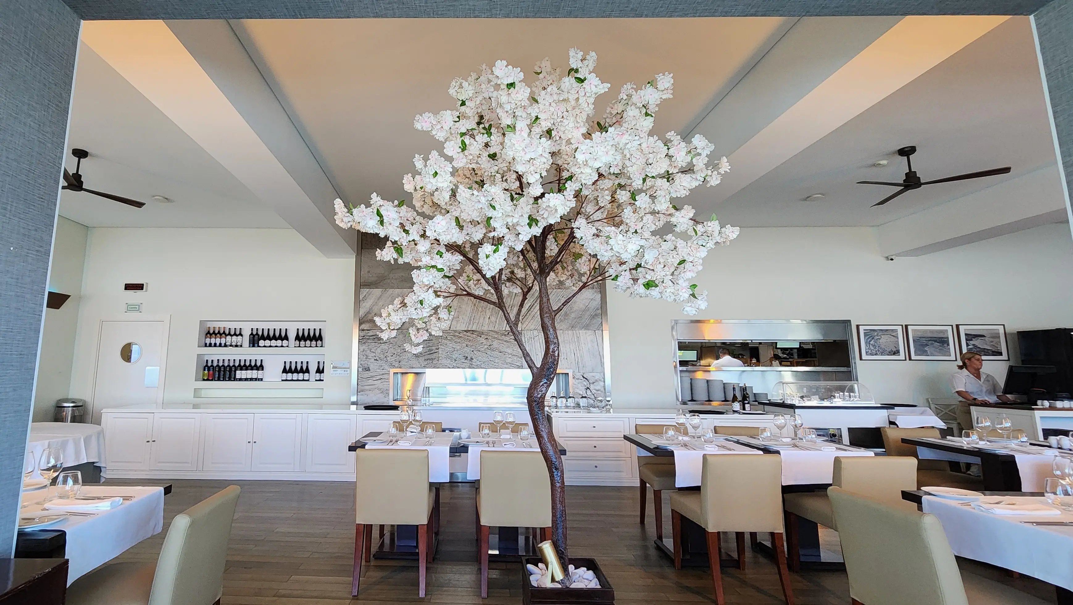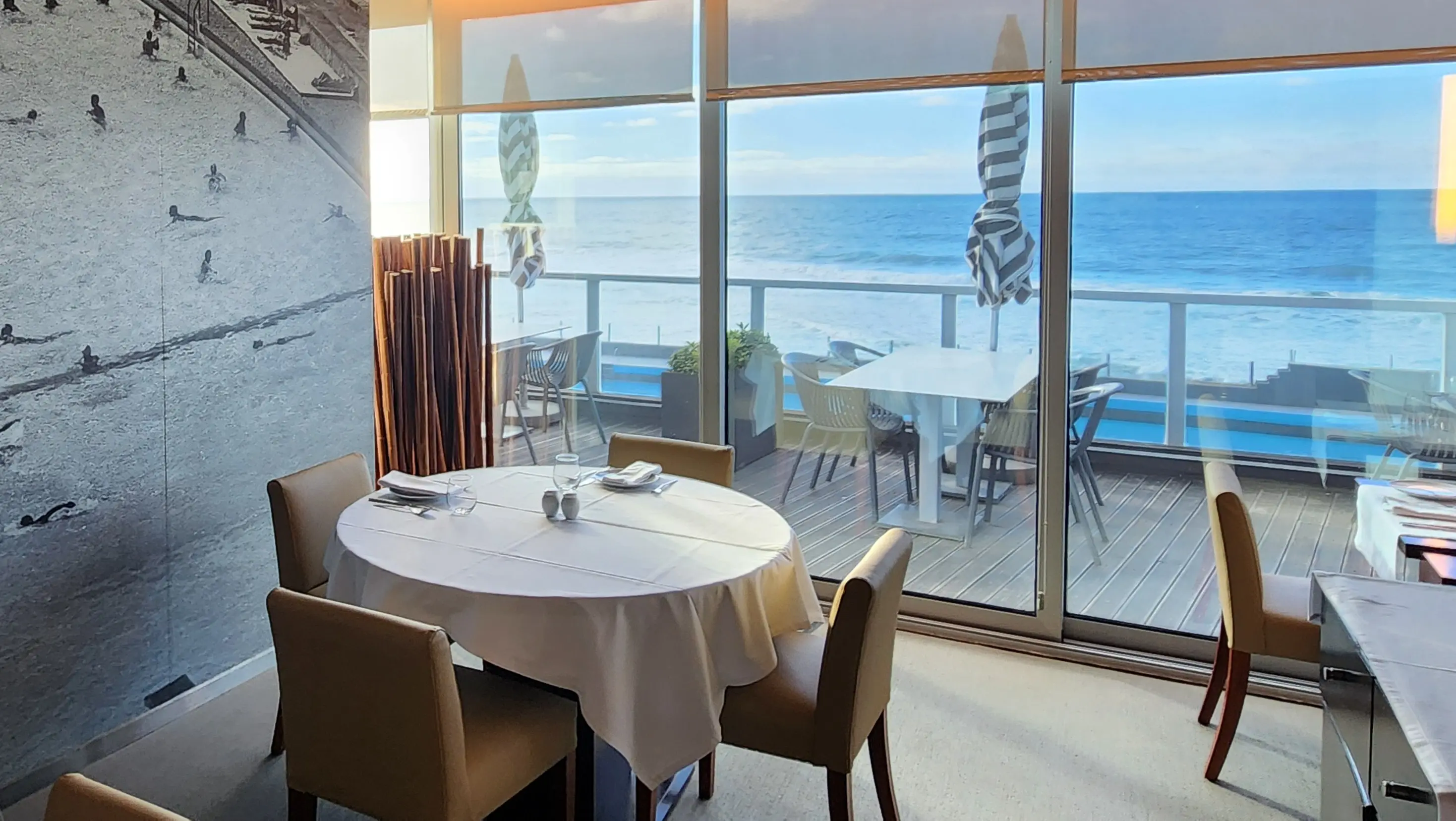 The décor is modern and breezy, featuring neutral tones, natural textures, and elegant yet minimalist furnishings that allow the view to take center stage. Sleek wooden tables, soft lighting, and clean lines give it a sophisticated beachside aesthetic. The open-air terrace offers front-row seats to the Atlantic, and every table feels like a private moment with nature.