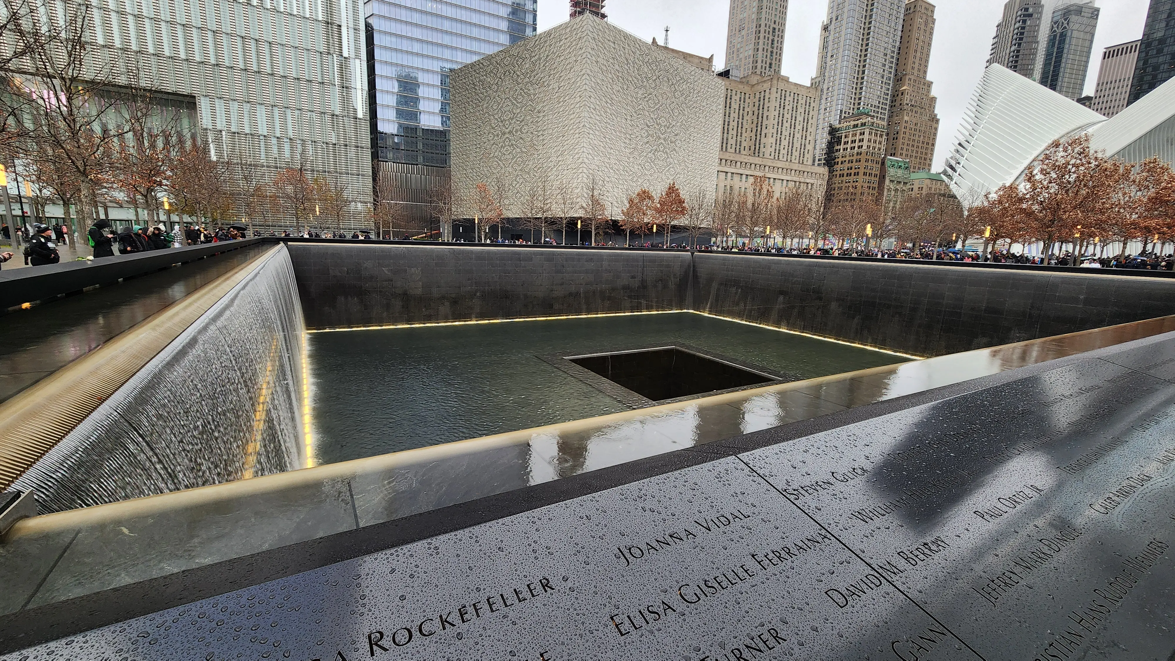 The Memorial Plaza features two enormous reflecting pools, set within the footprints of the original Twin Towers. These pools, each nearly an acre in size, are lined with waterfalls that cascade down into a central void, creating a powerful symbol of loss and absence. Surrounding the pools, the names of the victims are inscribed on bronze panels, offering a poignant reminder of the individual lives affected by the events of that day. As I walked around the pools, the serene atmosphere allowed for quiet contemplation, and I couldn’t help but feel a deep sense of respect for those who were lost.