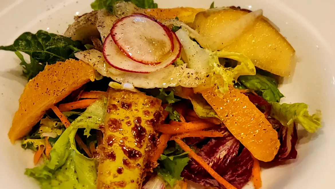 The evening began with the Insalata Mista, a refreshing salad of mixed greens, charred pear, radish, arugula, orange segments, and shaved fennel, all dressed in extra-virgin olive oil and aged balsamic vinegar. The combination of flavors was light and invigorating, a perfect start to the meal.