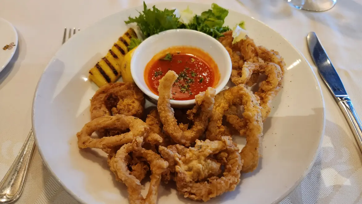 Next, we tried the fried calamari appetizer. Lightly battered and perfectly fried to a golden crisp, the calamari is tender on the inside with a satisfying crunch on the outside. Served with a zesty marinara dipping sauce, it offers a harmonious balance of textures and flavors, making it a crowd-pleaser for seafood lovers.