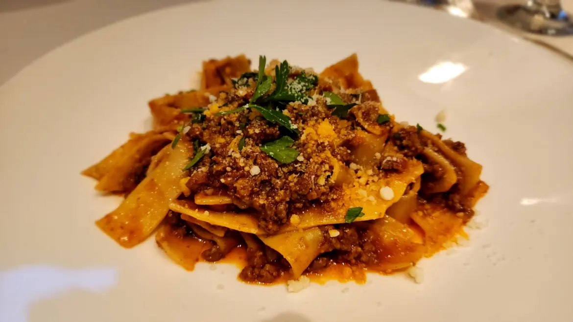 I also sampled the Pappardelle allo Bolognese. This dish featured wide ribbon buckwheat pasta paired with a hearty Nebbiolo wine-braised tomato and meat ragu. The pasta was perfectly al dente, and the robust ragu was deeply satisfying.