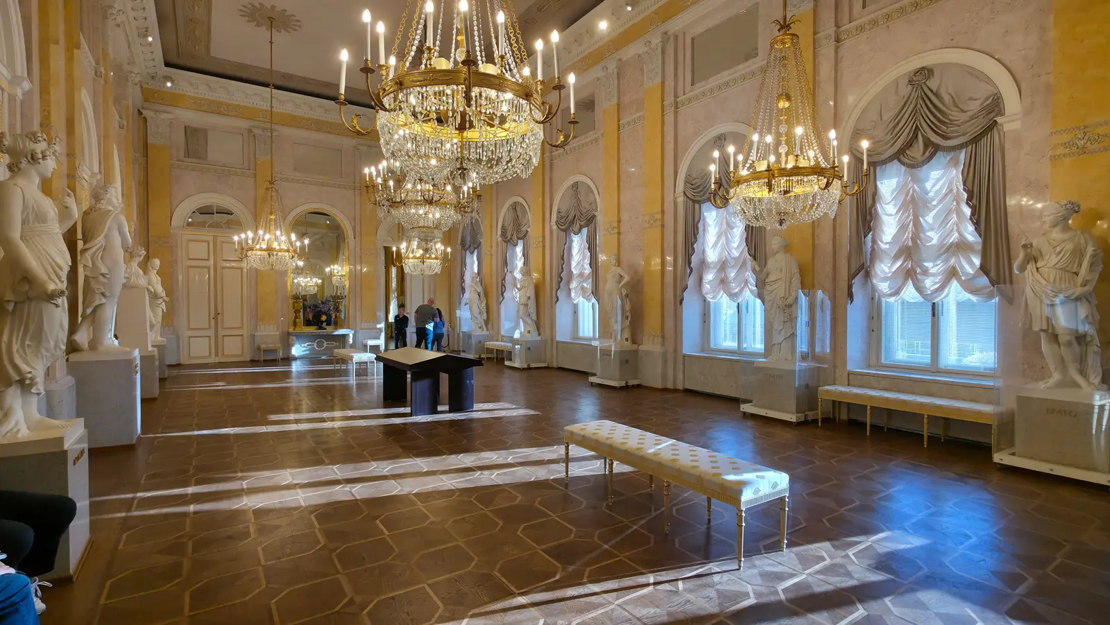 🚪 State Rooms: 20 restored imperial rooms — silk wall coverings, parquet floors, chandeliers