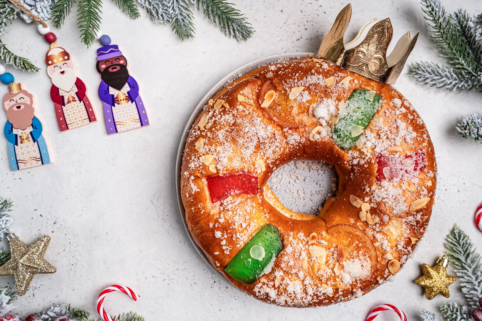🍰 Roscón de Reyes: Round cake with candied fruit and hidden surprises, shared on January 6