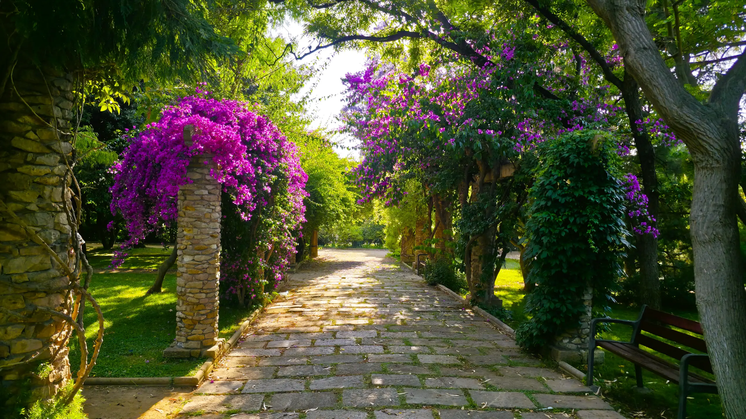 The Jardí d’Aclimatació is one of Montjuïc’s hidden gems, a botanical garden created in 1930 by Nicolau M. Rubió i Tudurí to showcase Mediterranean and subtropical species. It’s a place where nature feels almost intimate: winding paths shaded by palm and pine, small stone terraces filled with flowers, and benches tucked between flowering shrubs. As you wander through its two levels connected by stone steps, you’ll see hibiscus, bougainvillea, oleander, lavender, and geraniums, their colors glowing against the silvery greens of olive and laurel. With over 230 different plant species, butterflies flutter from bloom to bloom, and the air carries the faint scent of jasmine and warm earth.
