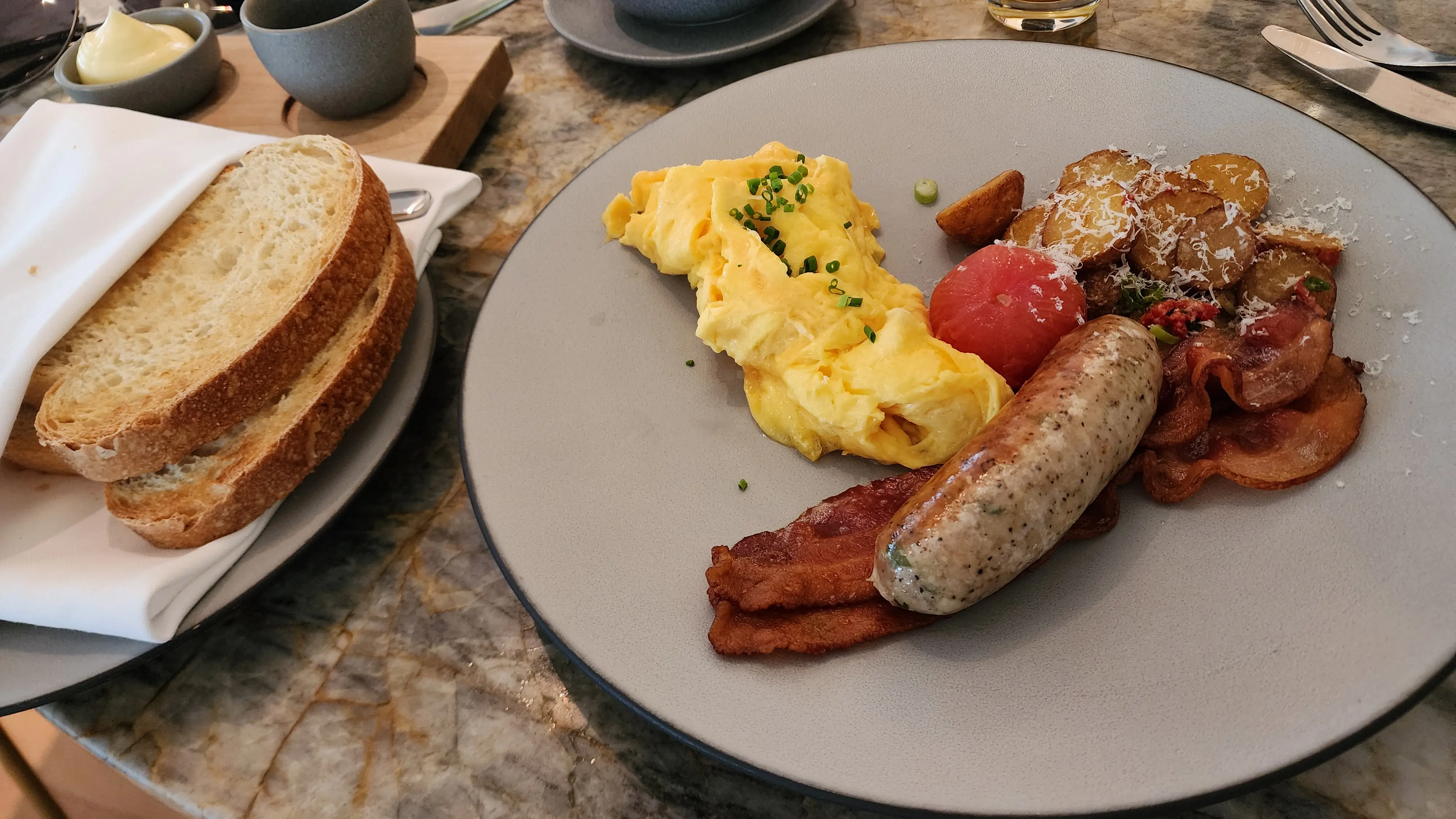 This hearty breakfast platter was a feast for both the eyes and the palate. The free-range scrambled eggs were cooked to perfection—fluffy and flavorful. Accompanied by smoked bacon, pork sausage, and crispy potatoes, this dish offered a delightful variety of tastes and textures. The artisanal toast on the side, freshly baked and perfectly toasted, was the ideal vessel for savoring every last bit of the delicious eggs and sausages.