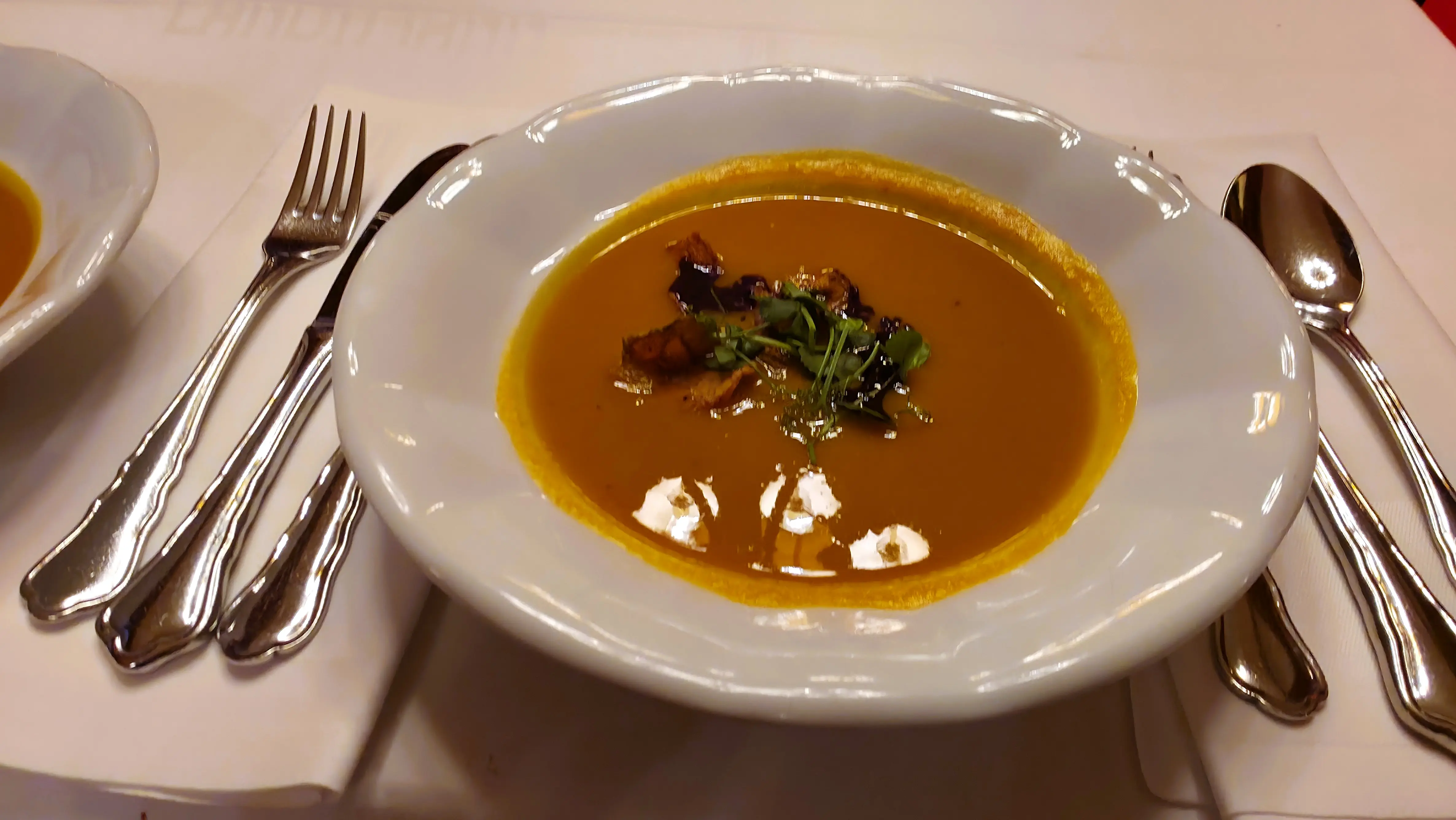 Our evening at Café Landtmann was a reminder that Viennese cuisine, when done properly, requires no reinvention. We began with the Carrot and Ginger Soup (vegan) – light, warming, and balanced, with subtle spice rather than excess. Finished with parsley oil and crisp croûtons, it set a calm, confident tone for the meal. It was modern without trying to be contemporary, thoughtful without abandoning tradition.