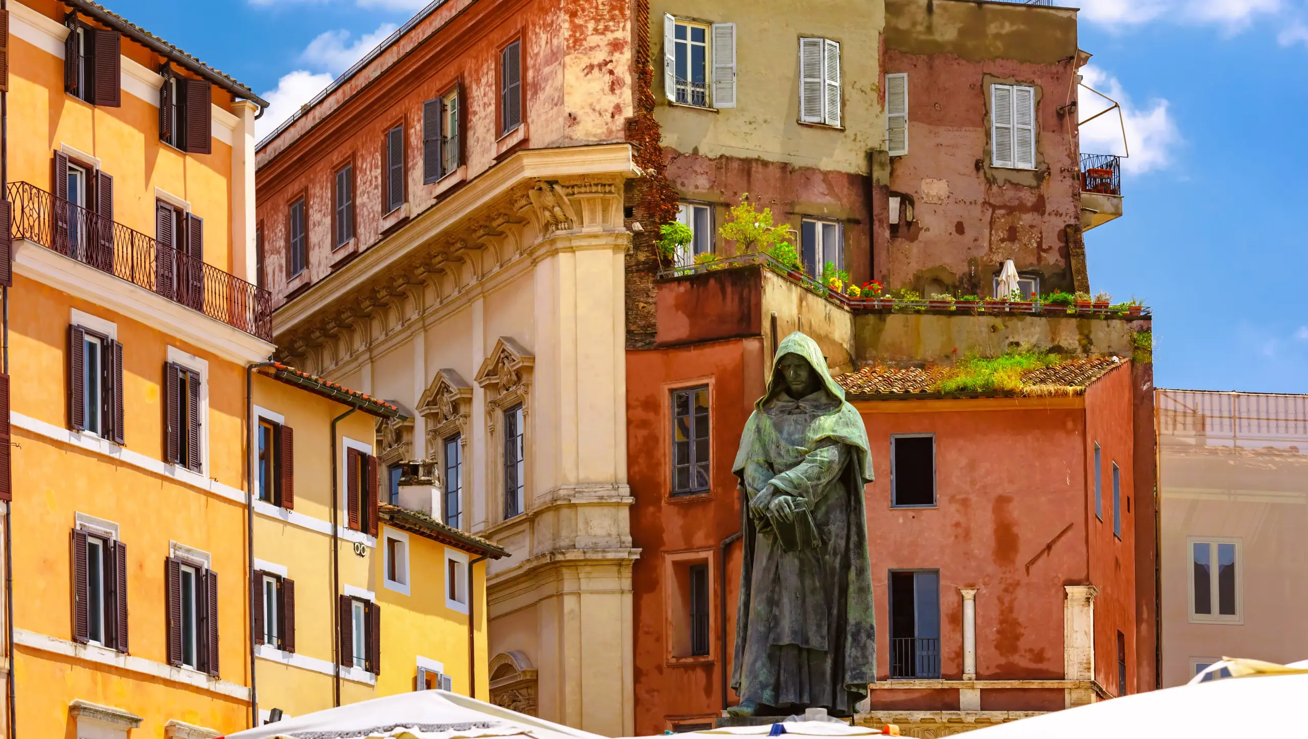 At the heart of Campo de’ Fiori stands the solemn statue of Giordano Bruno – dark, hooded, unyielding. His presence anchors the square, reminding you that this cheerful place once witnessed tragedy. Executed here in 1600 by the Roman Inquisition, Bruno was burned at the stake for refusing to recant his philosophical and theological views, including his support for Copernican heliocentrism and his belief in an infinite universe with countless worlds. He represents intellectual courage and the cost of challenging authority. His statue doesn’t seek attention – it simply stands, watching centuries pass.