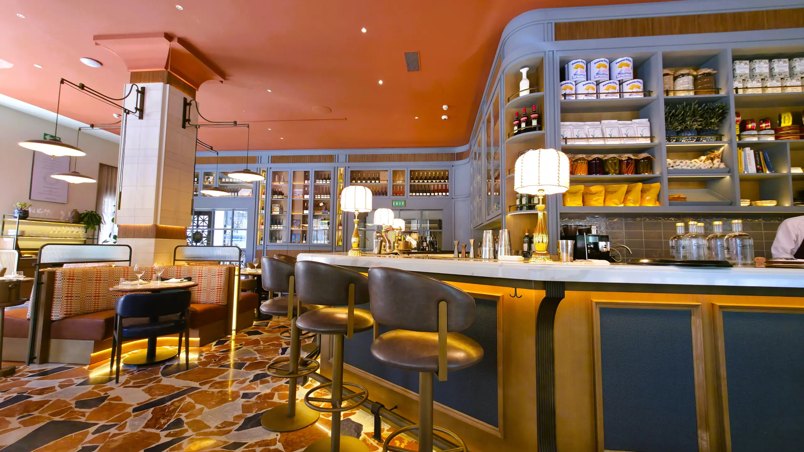 Inside, that sense of home and heritage lingers. The interior design, by Sagrada Studio, merges contemporary Mediterranean style with subtle nods to the building’s Neoclassical roots. There’s a harmony between textures: marble counters, soft linen upholstery, rustic wood, and modern metal accents. Natural light floods in during the day, while evenings bring a golden intimacy, the kind of glow that makes every table feel like its own little world.