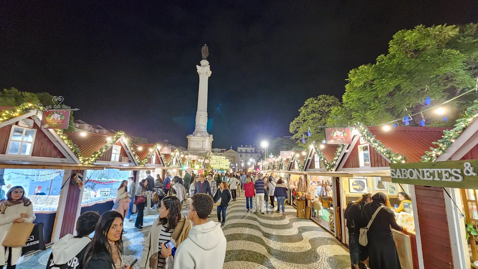 🛍️ Rossio Square: Wooden chalets with hot chocolate, ginjinha, bolo-rei, handmade crafts