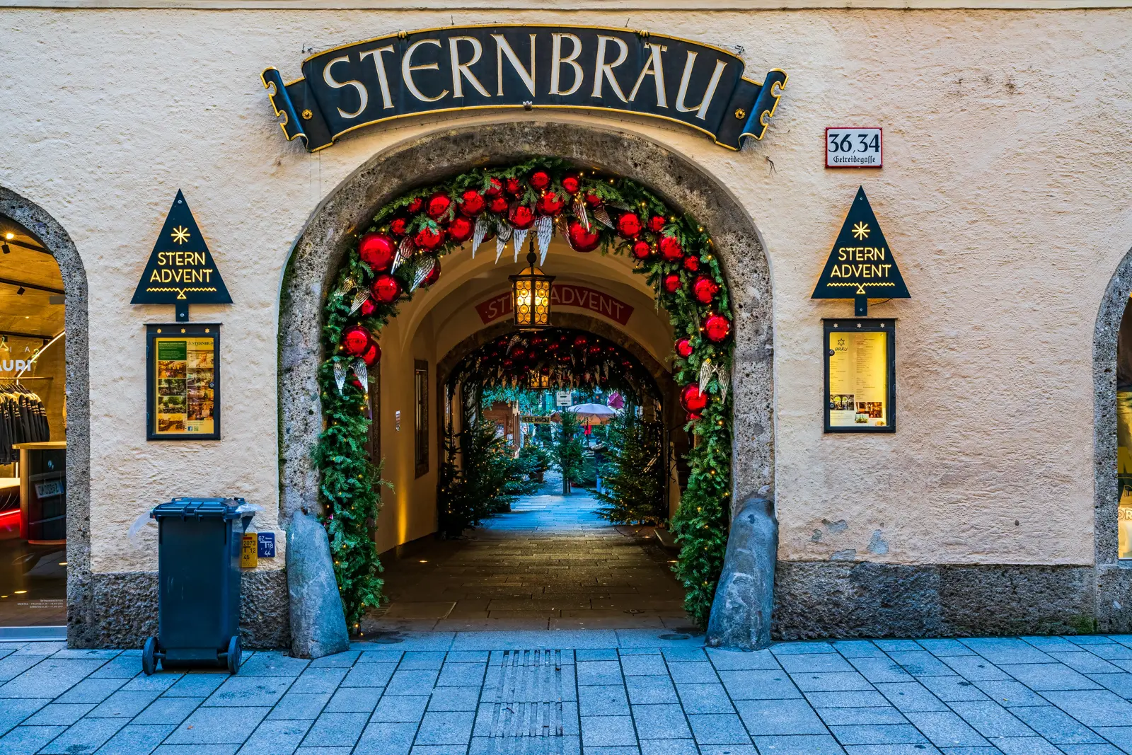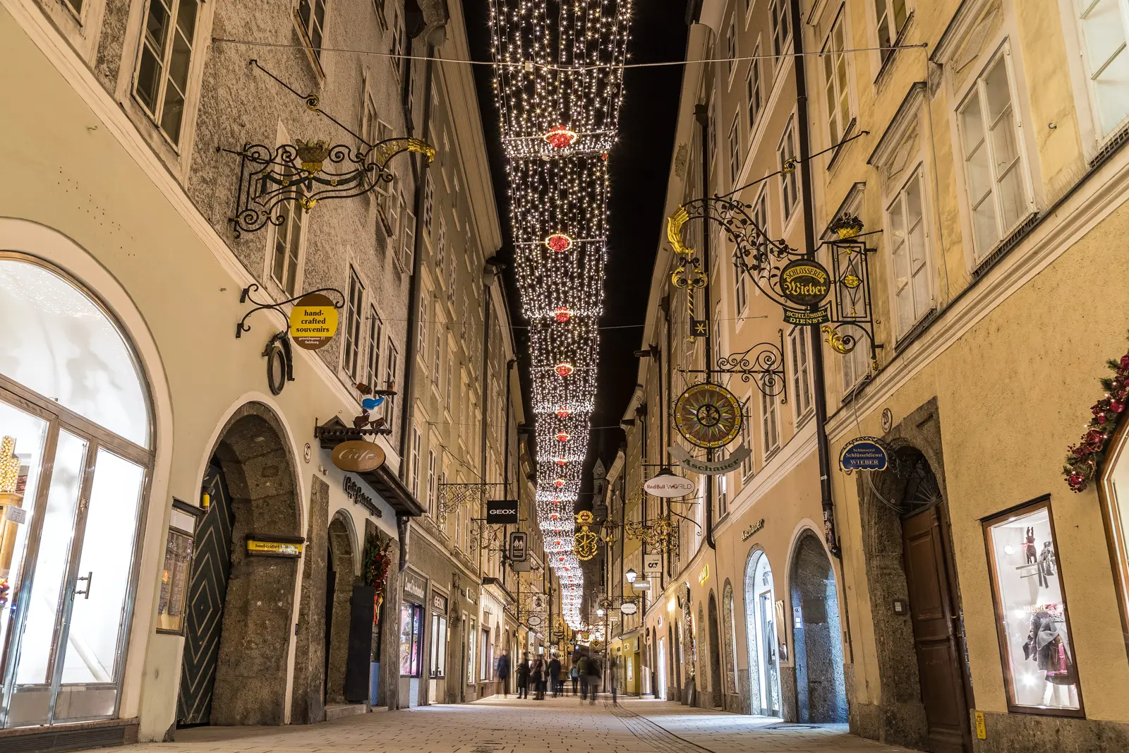 ✨ Old Town lights · Getreidegasse is tunnelled with overhead fairy lights, and the Salzach reflects the illumination. Most atmospheric after sunset, which falls as early as 4 pm in December.