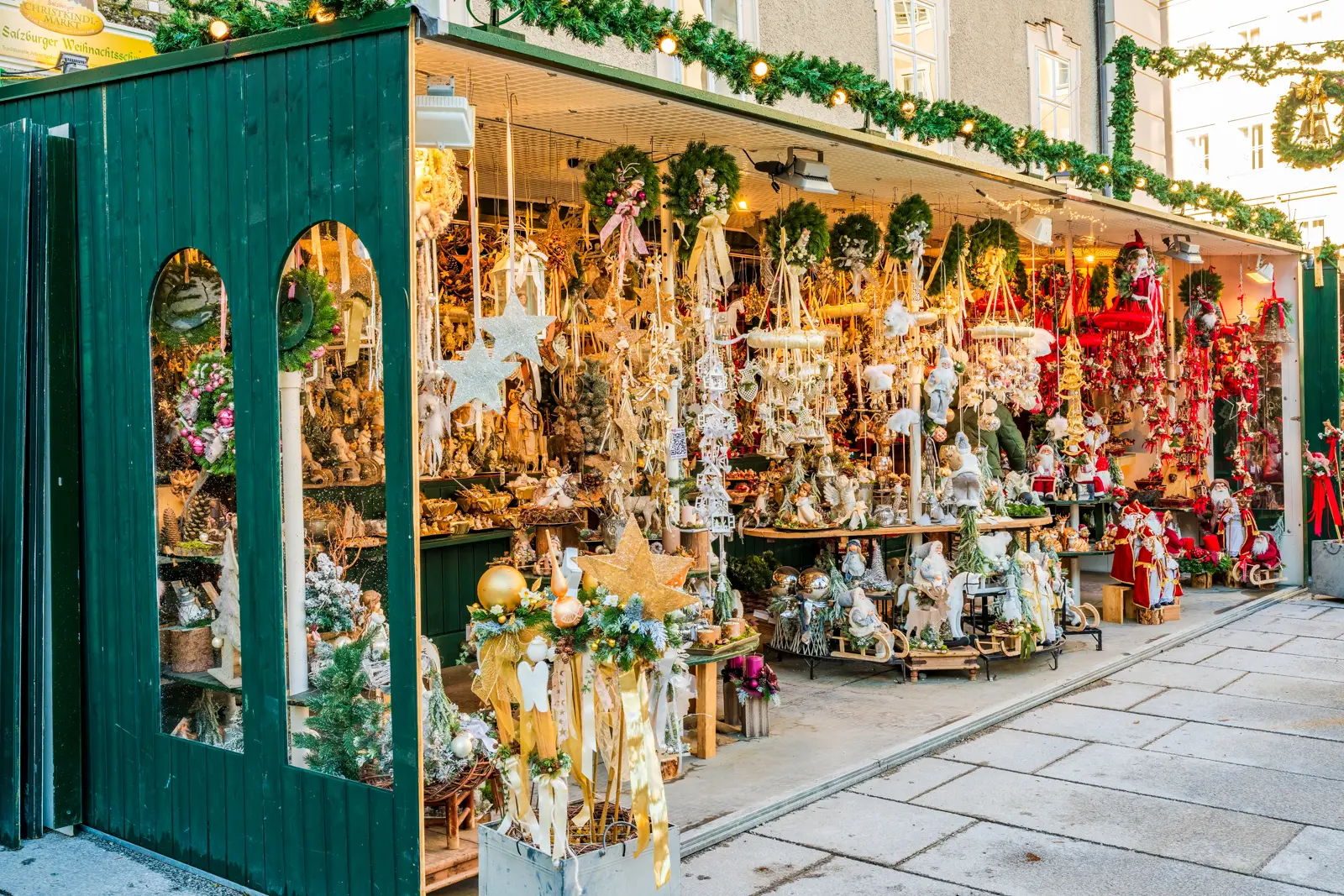 At the heart of the experience are Salzburg’s Christmas markets, most notably those set within Domplatz and Residenzplatz, where the historic centre becomes a gathering space defined by warmth and light. Wooden stalls are arranged with careful symmetry, their roofs dusted with seasonal decoration, creating pathways that naturally guide visitors through the space while encouraging moments of pause and observation.