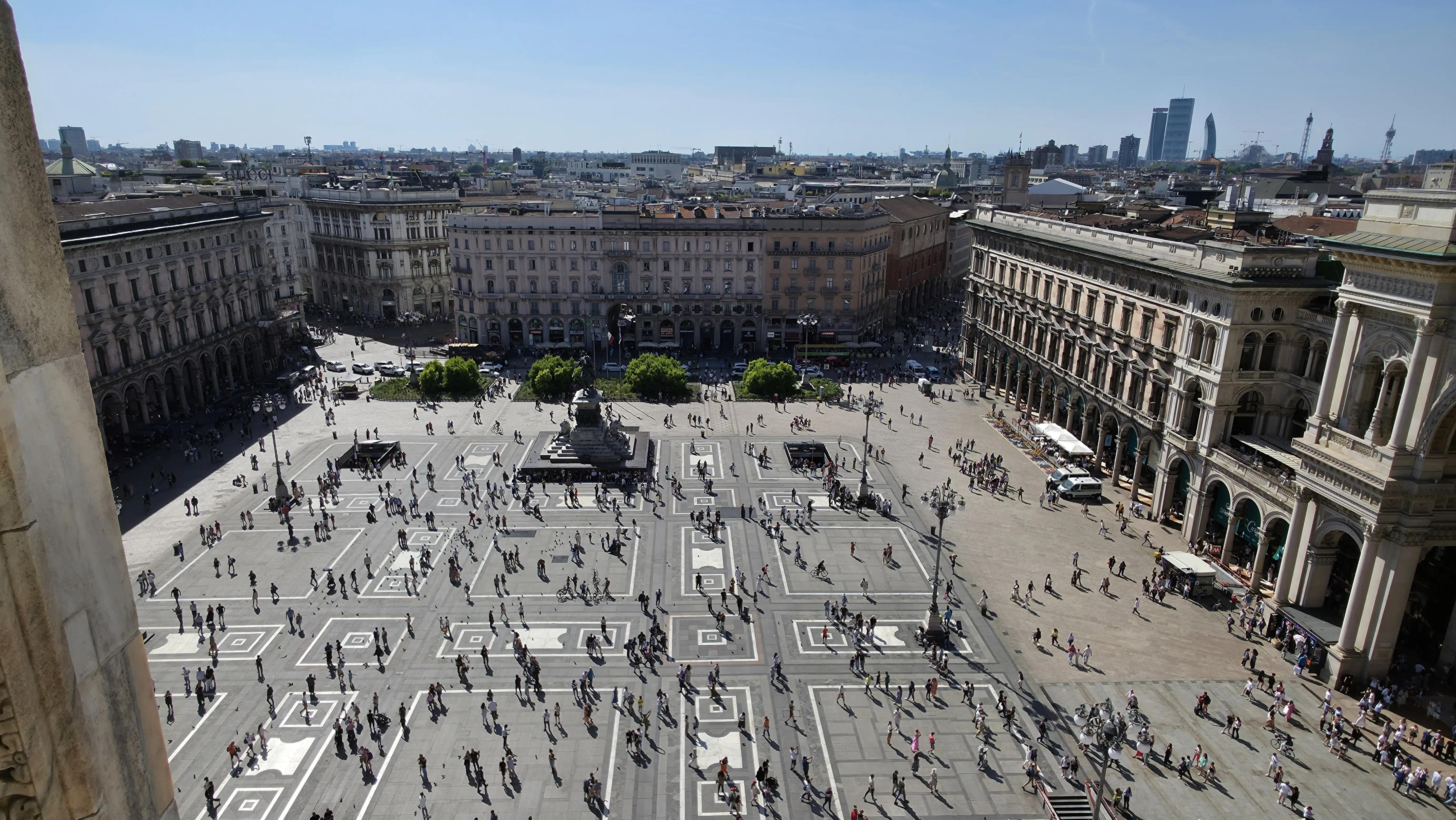 - Piazza del Duomo spreads out directly below, where tourists look like tiny figures wandering among street performers and cafés.
