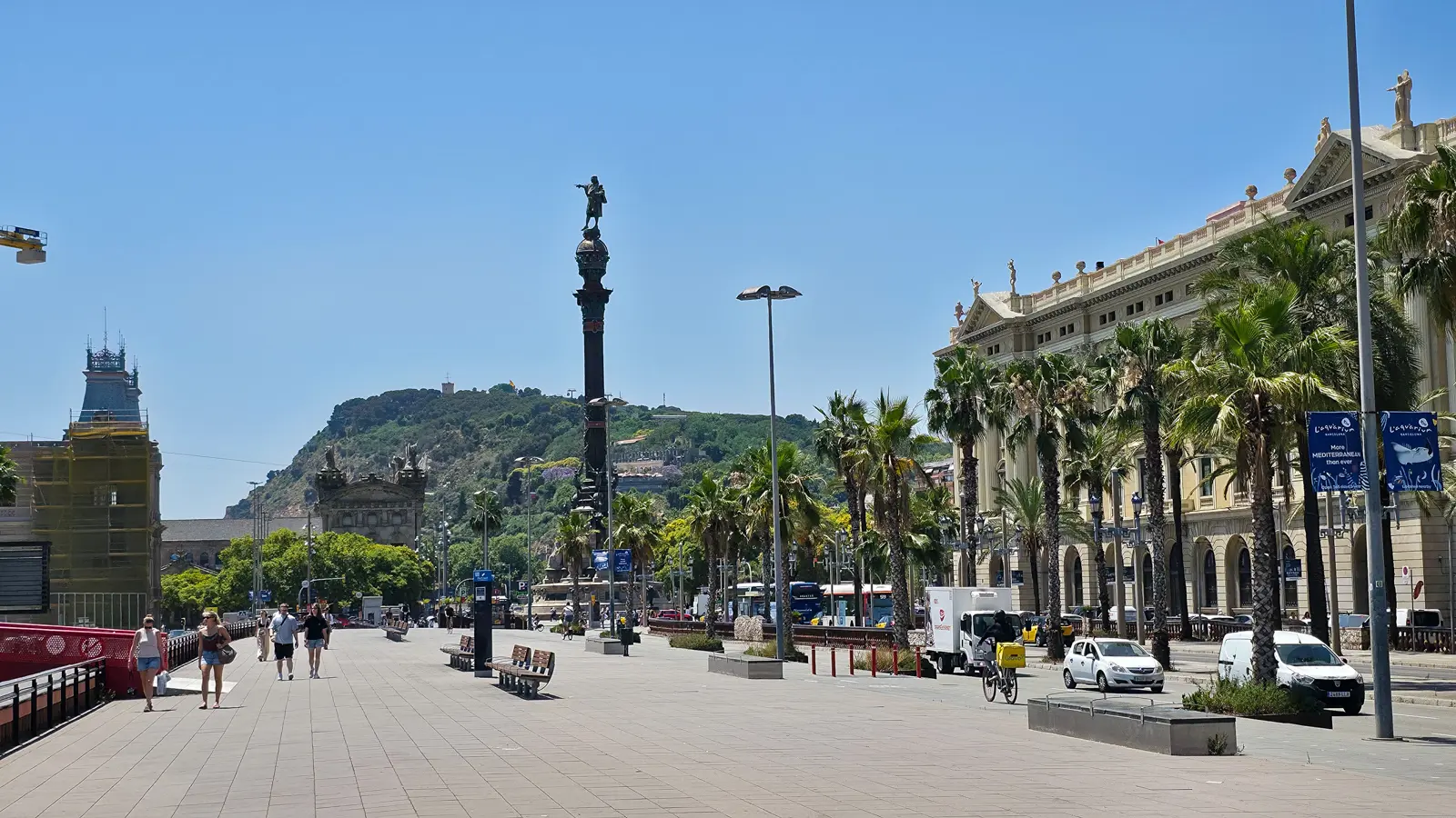 The monument sits in Plaça del Portal de la Pau, a lively crossroads where buskers play, tourists pause for photos, and locals stroll toward the waterfront. Palm trees sway overhead, pigeons scatter across the square, and the masts of sailboats frame the skyline. It’s one of those places where Barcelona’s rhythm – history, music, and sea air – feels perfectly in sync.