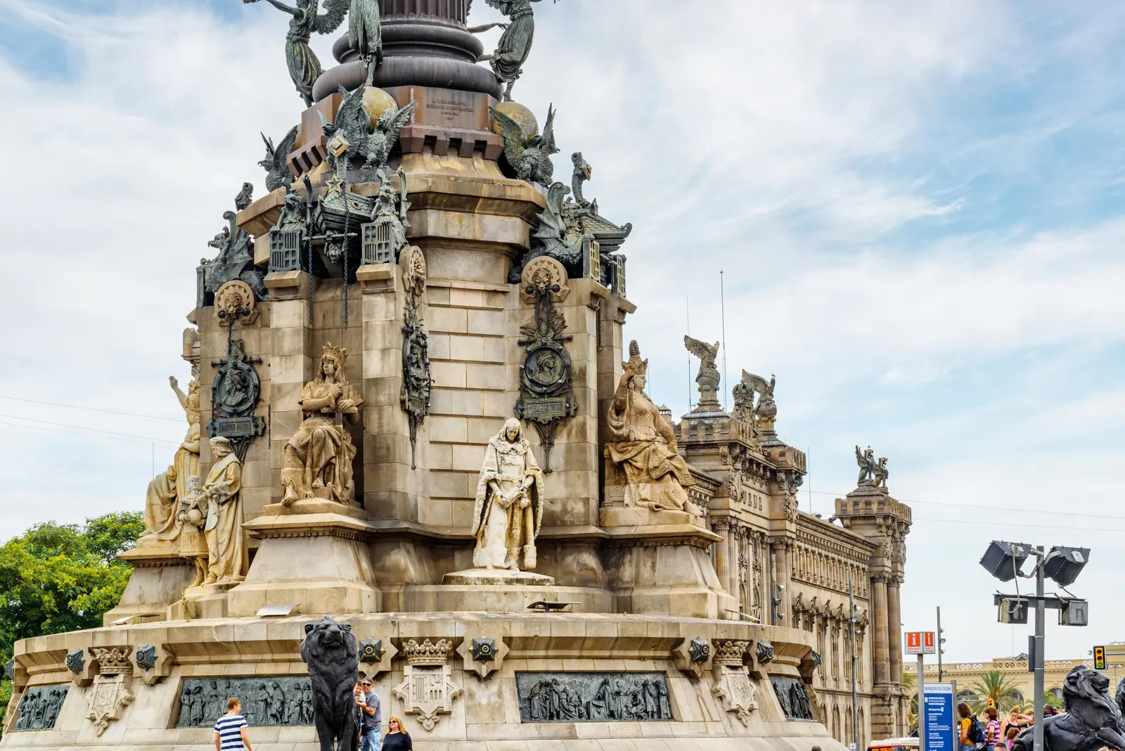 Its cast-iron column was forged in sections across Catalonia’s industrial foundries, a proud achievement of 19th-century engineering. The base, carved from stone and adorned with bronze reliefs, tells stories of Columbus’s voyage, his presentation before the Catholic Monarchs, and allegories of the four continents, navigation, and Catalonia. Every detail feels deliberate, from the winged victories to the sculpted lions that guard the plinth.