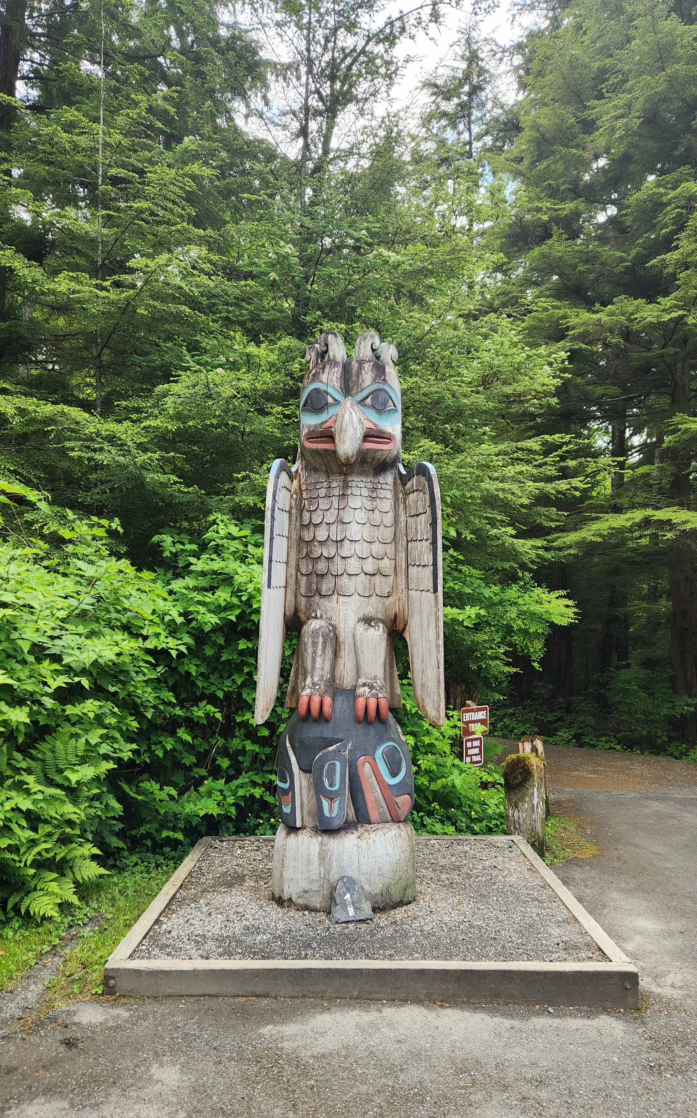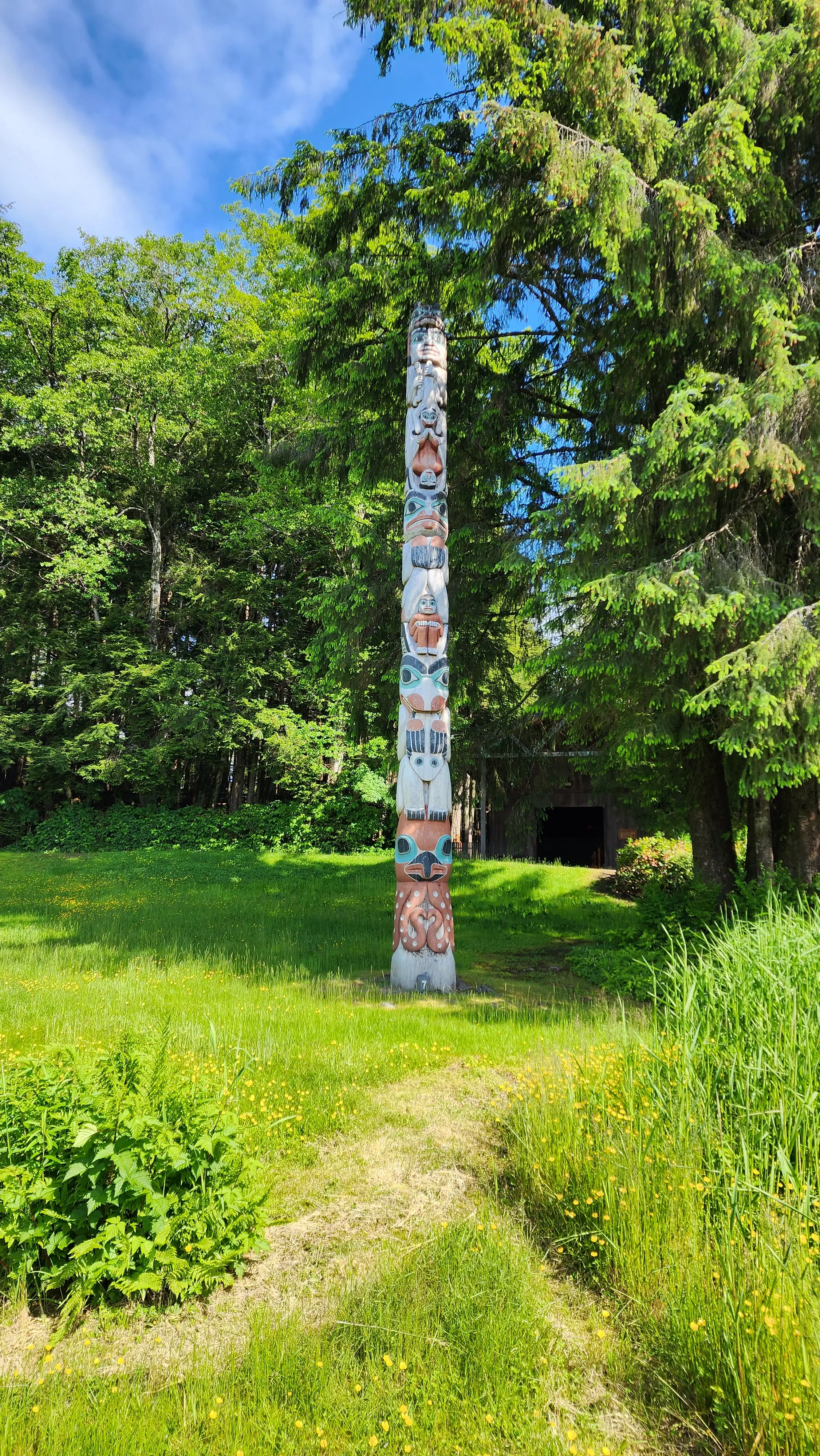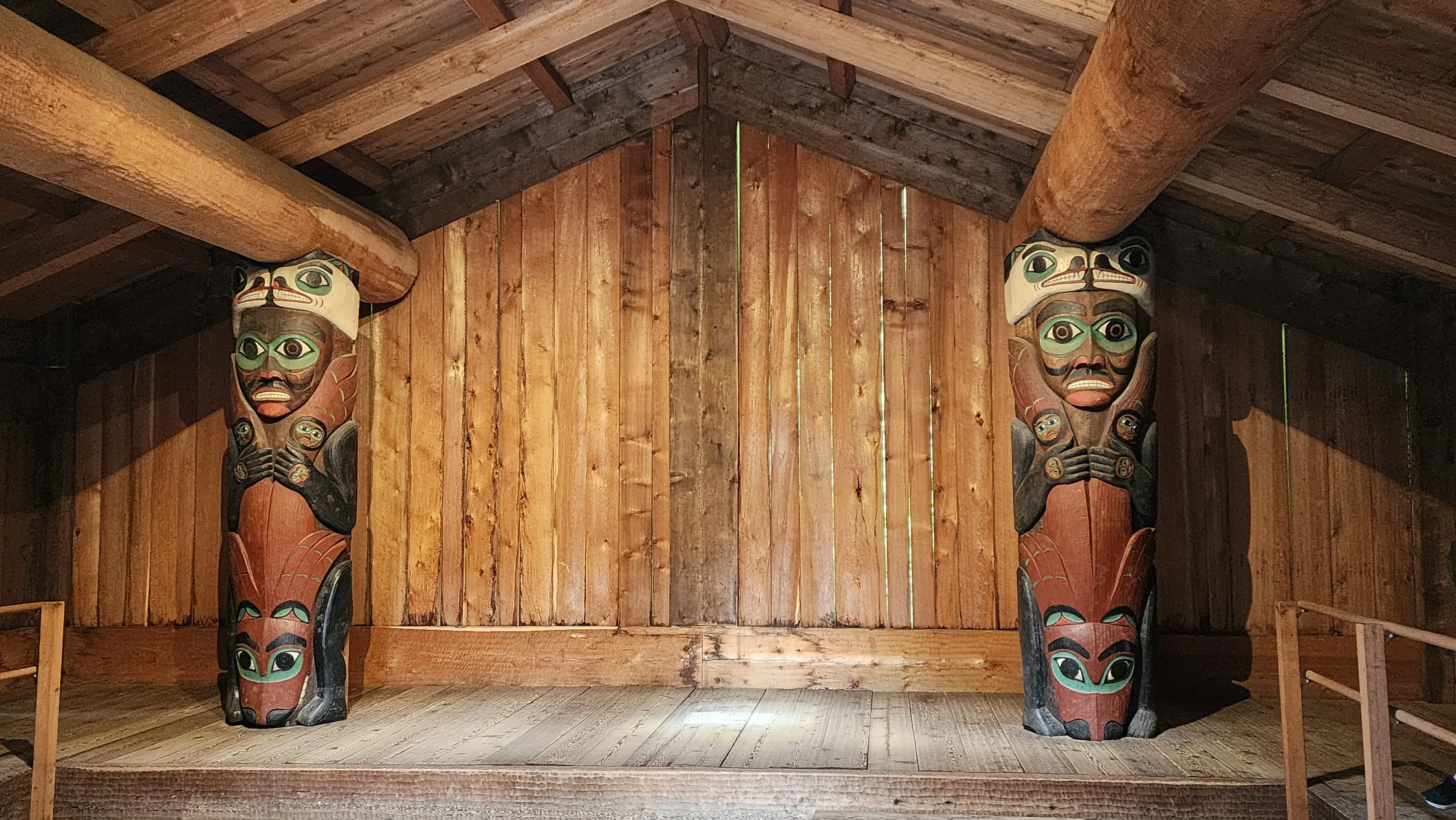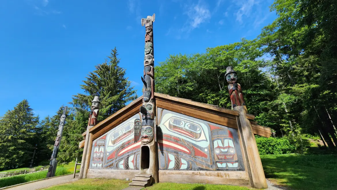 One of the highlights of the park is the colorful Clan House. This stunning structure, with its intricate carvings and vibrant artwork, offers a fascinating glimpse into the living quarters that would have been shared by 30 to 50 family members of the same lineage, led by a house chief. Inside, the large room with a central fireplace surrounded by a planked platform felt like stepping back in time. It was amazing to see how the space was designed to foster community and shared living.