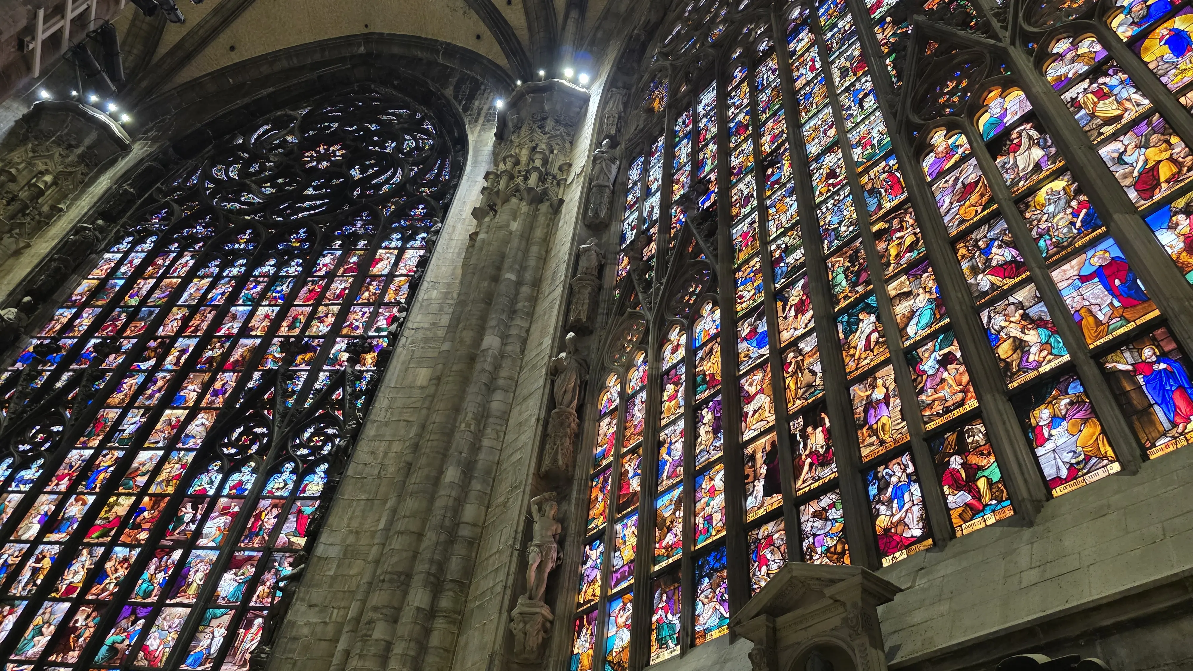 Stepping inside, the change in atmosphere is immediate: from the lively square to an environment of reverence and serenity. The first thing that catches your eye is the immense scale of the stone columns, 52 in total, each representing a week of the year, soaring up to the intricately ribbed ceiling. The filtered sunlight streaming through the stained glass creates pools of color that dance across the stone floor.