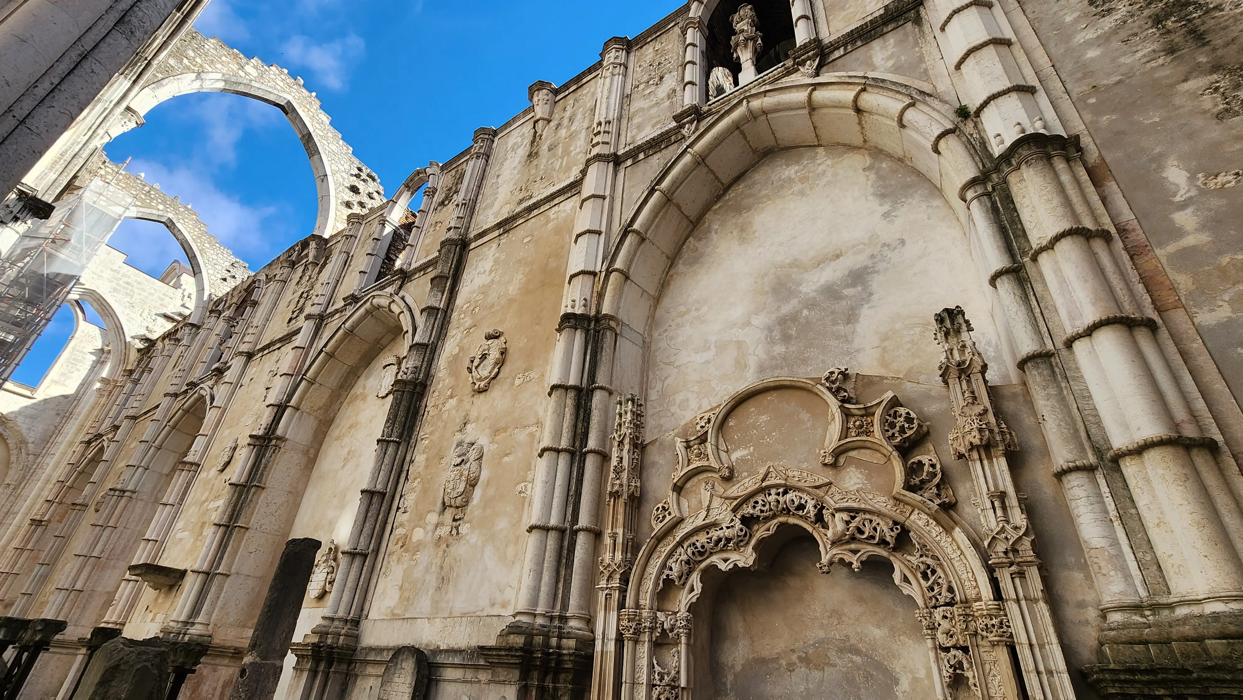 What remains today are the soaring stone arches, intricately carved columns, and fragments of its original grandeur, now open to the sky. There is something breathtaking about standing there, looking up at the empty space where a vaulted ceiling once stood, now replaced by the soft Lisbon light and blue skies.