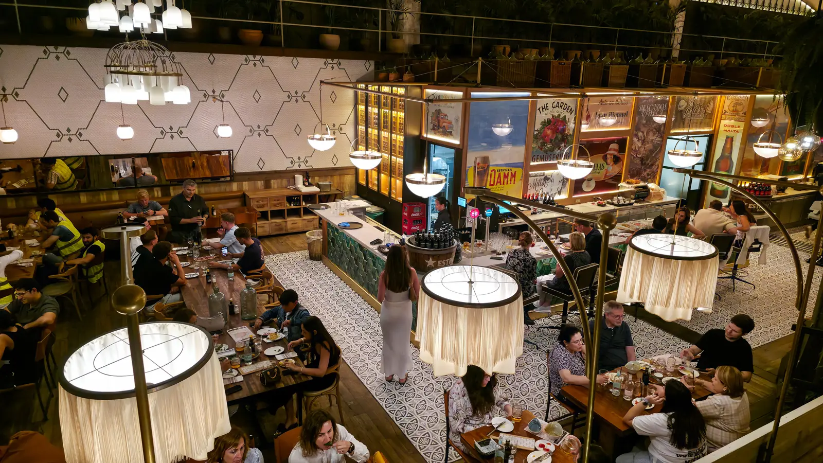 By the early 2000s, the building sat silent and forgotten, a relic of another era. In the following decade, restaurateurs Joan Canadell and Subirats Bureu envisioned giving it a new purpose through their newly-formed company Ocio Gastronómico Barcelona S.L.: to create a space that would celebrate the flavors and spirit of the entire Iberian Peninsula. The venue was inaugurated on October 25, 2014, the result of a stunning transformation by interior designer Lázaro Rosa-Violán Studio, who drew inspiration from Barcelona of the 1930s and 1940s while preserving the building’s industrial character.