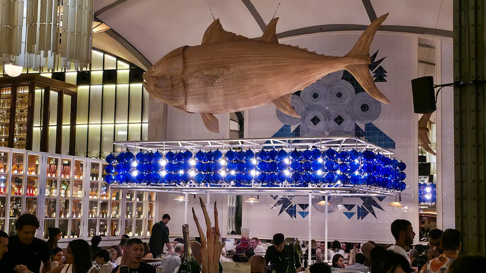 🐟 La Llotja — Mediterranean seafood named after Spain’s historic fish markets: turbot, hake, monkfish, razor clams · spectacular giant wooden fish sculpture and blue glass-float chandelier · reservations recommended