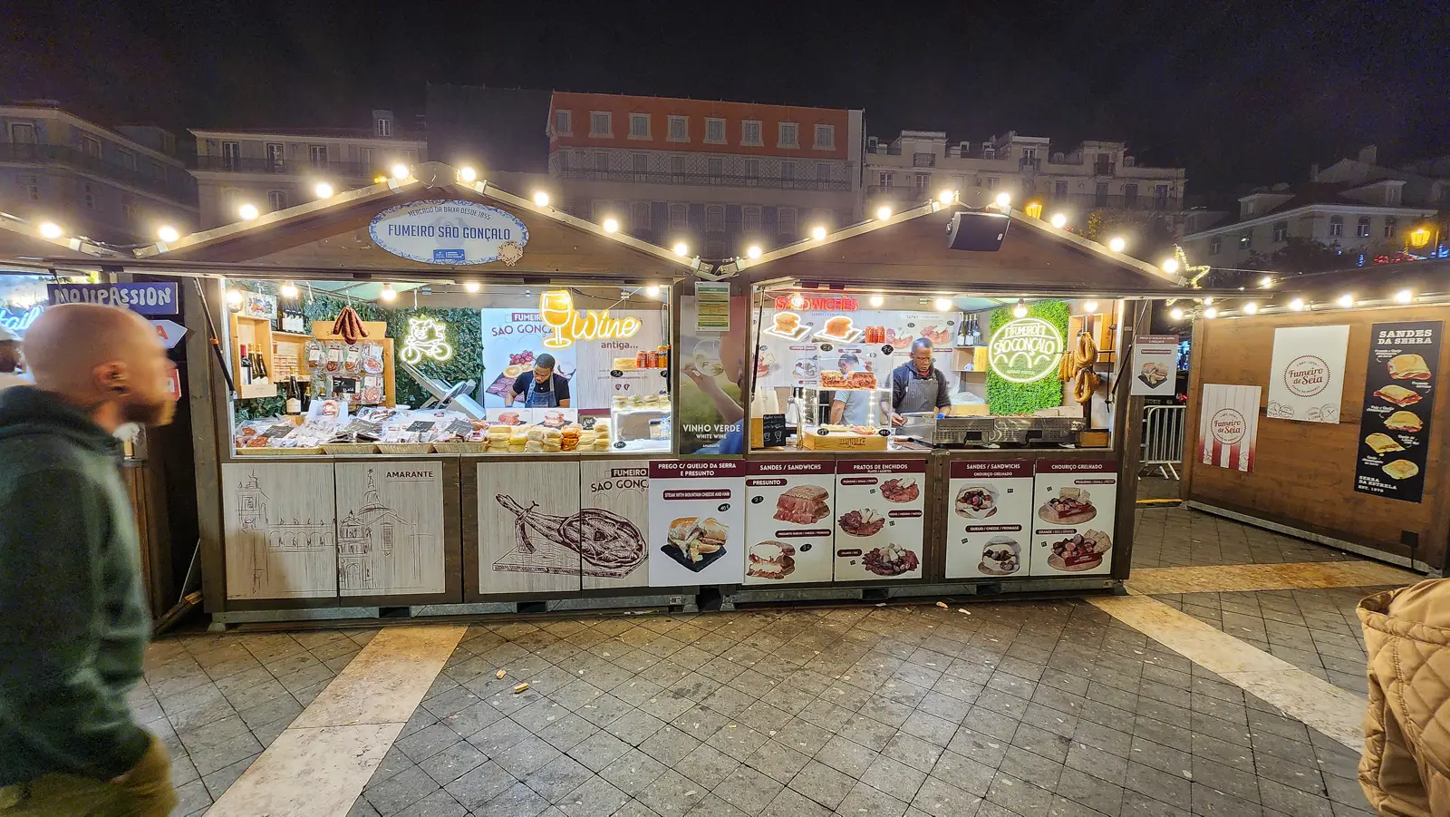 Praça da Figueira is already one of the most atmospheric squares in Lisbon, but during the Christmas Gourmet event, it becomes even more beautiful. Wooden stalls glow beneath strings of warm lights. The giant Christmas tree adds sparkle, and the square’s elegant geometry gives the event a natural sense of openness and charm. From one side of the square, you see the equestrian statue of King João I rising proudly above the lights; from the other, São Jorge Castle peeks between the rooftops, illuminated softly as the evening sky deepens into blue.