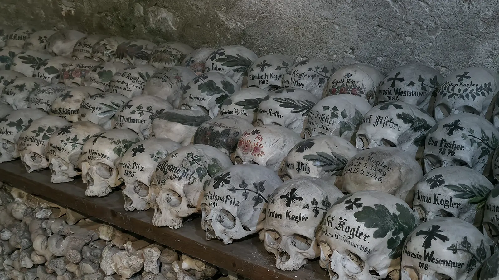 💀 Ossuary (Beinhaus): Over 1,200 skulls, ~600 hand-painted with names, dates, and floral motifs — last skull added in 1995