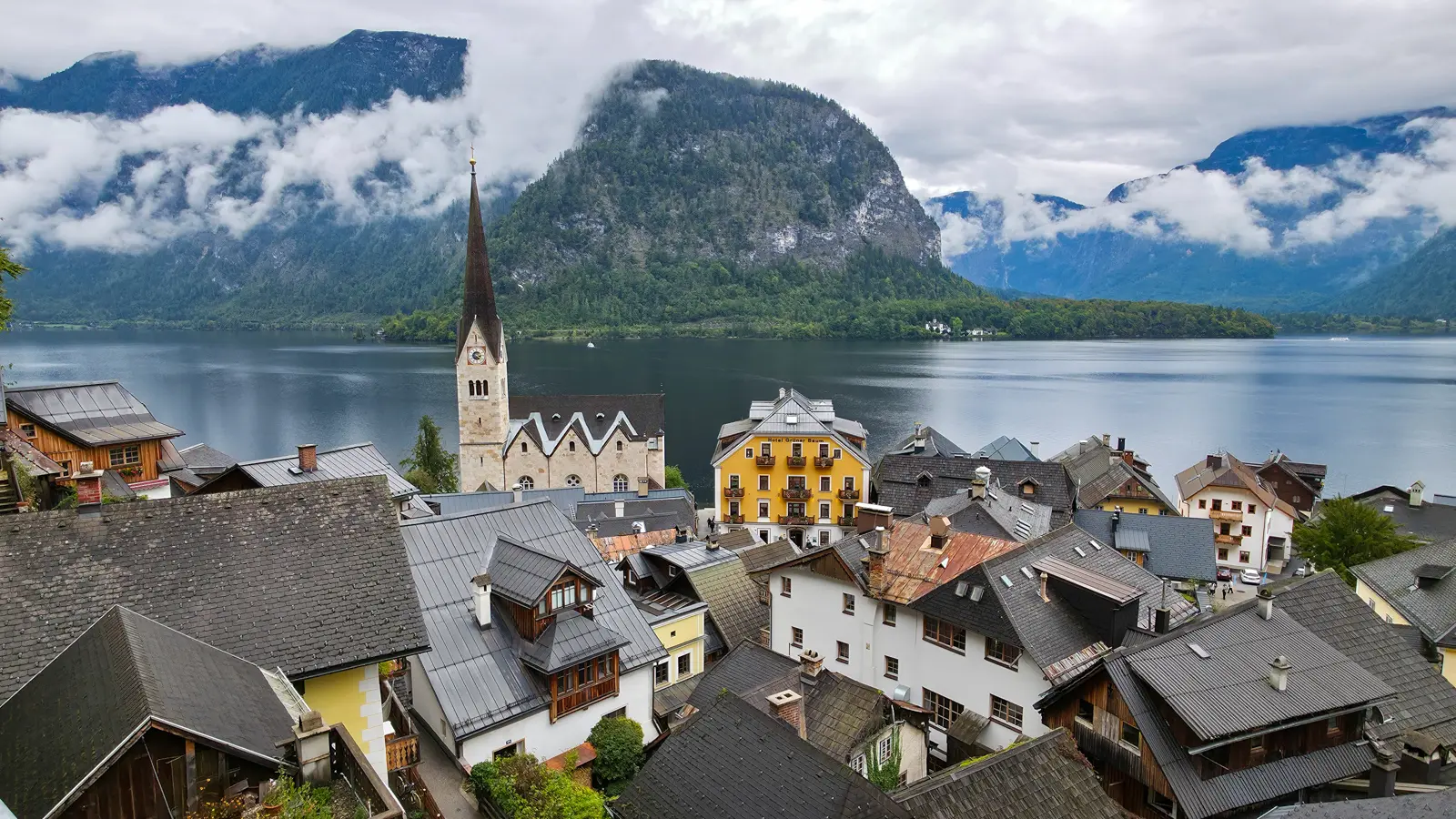 At the heart of Hallstatt’s visual identity stands the iconic Evangelische Pfarrkirche Hallstatt, its slender spire rising gracefully above the village and reflected almost perfectly in the still waters of Lake Hallstatt. It is a scene that has become synonymous with the village itself: serene, balanced, and deeply atmospheric. Whether seen through morning light or beneath low, misty clouds, the church anchors the landscape, offering a sense of harmony between nature and human presence.