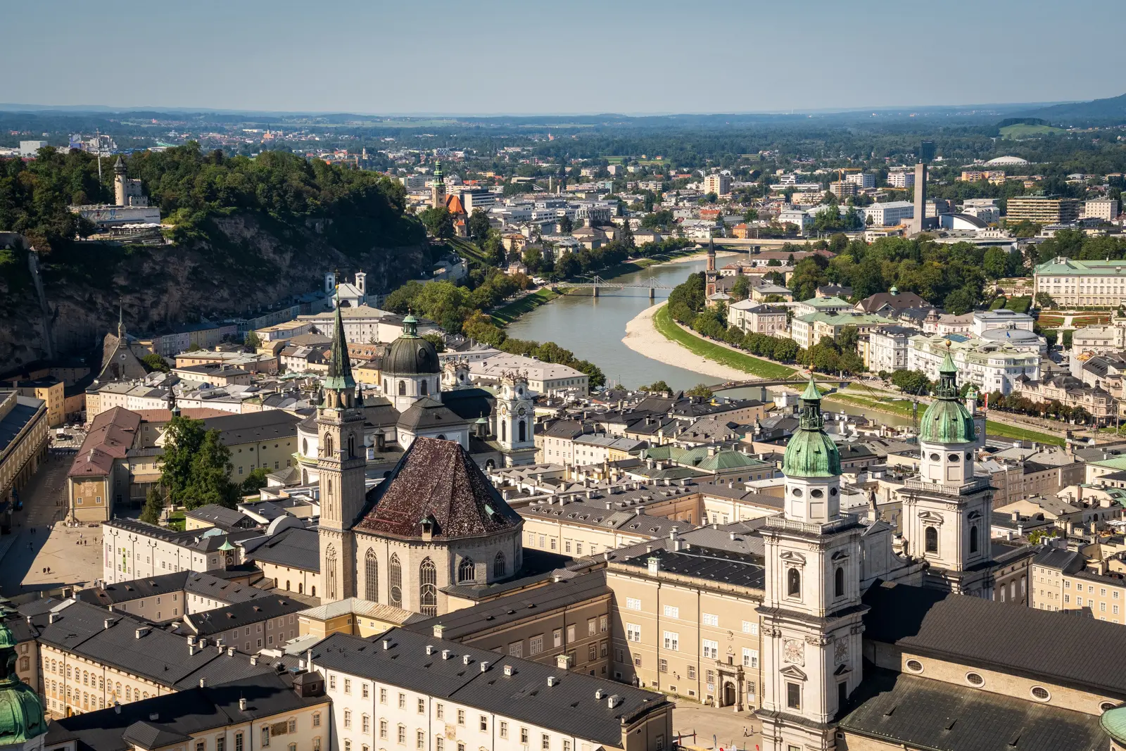 Beyond the urban fabric, the surrounding mountains rise with a quiet presence, framing the city and extending the view into the distance. This broader landscape provides a sense of scale that is not immediately apparent from within the city itself. From above, Salzburg feels both contained and expansive, defined by clear boundaries yet open to its surroundings.