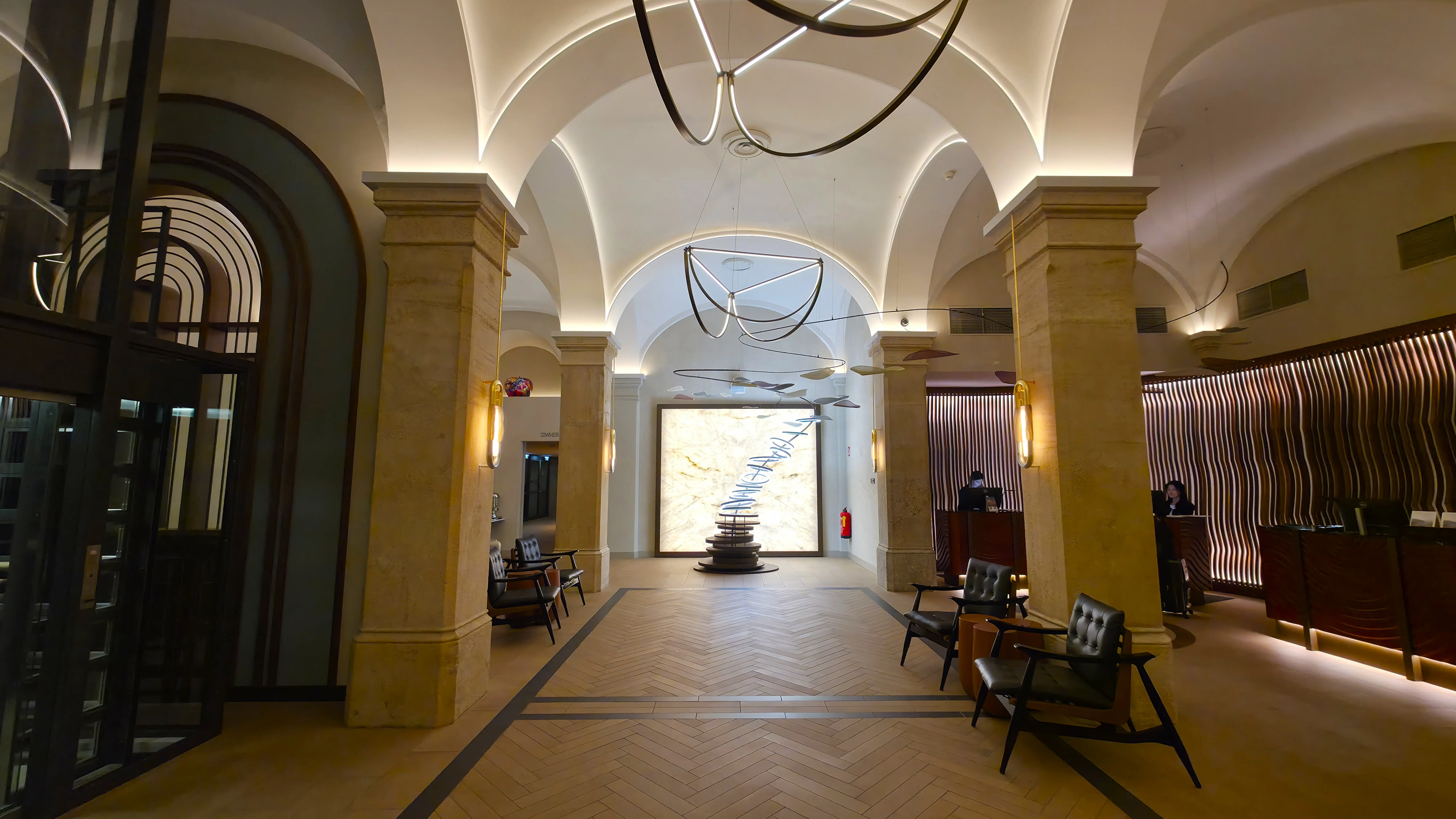 From the moment you enter the lobby, the atmosphere feels composed and intentional. Vaulted ceilings and preserved structural elements from the original riding school create a sense of vertical openness, while arches and columns guide movement through the space without directing it too rigidly. The design never overwhelms; instead, it allows the architecture to breathe, honoring the building’s original scale and proportions.