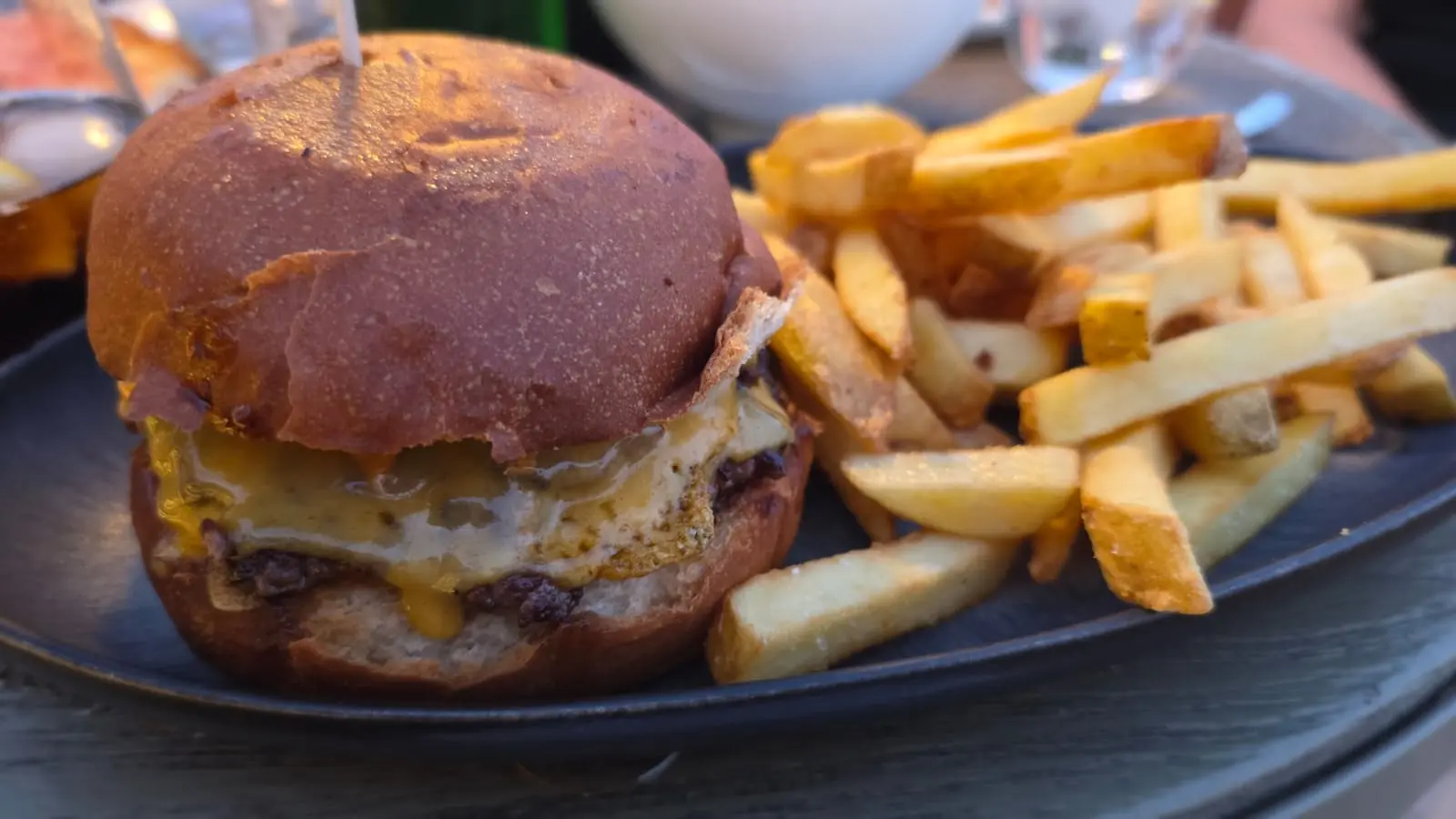A rooftop indulgence. Caramelized edges, gooey cheese, tangy pickles, and a house sauce that ties everything together. It’s the kind of burger you eat slowly because every bite is worth savoring.