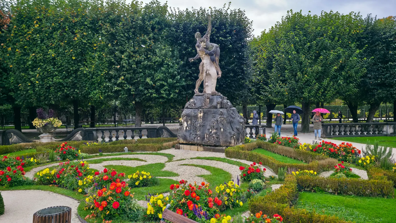 At the heart of the Grand Parterre stands the central fountain, surrounded by four groups of mythological figures representing the elements: fire, air, earth, and water. Created by artists of the late 17th century, these sculptures anchor the composition, giving the space a focal point around which the Baroque geometry radiates outward. In the smaller parterre alongside the palace, the Pegasus Fountain offers a second, more intimate centerpiece, a copper sculpture of the winged horse, forged in 1661 by Caspar Gras, that has become one of the most recognizable images of the gardens.