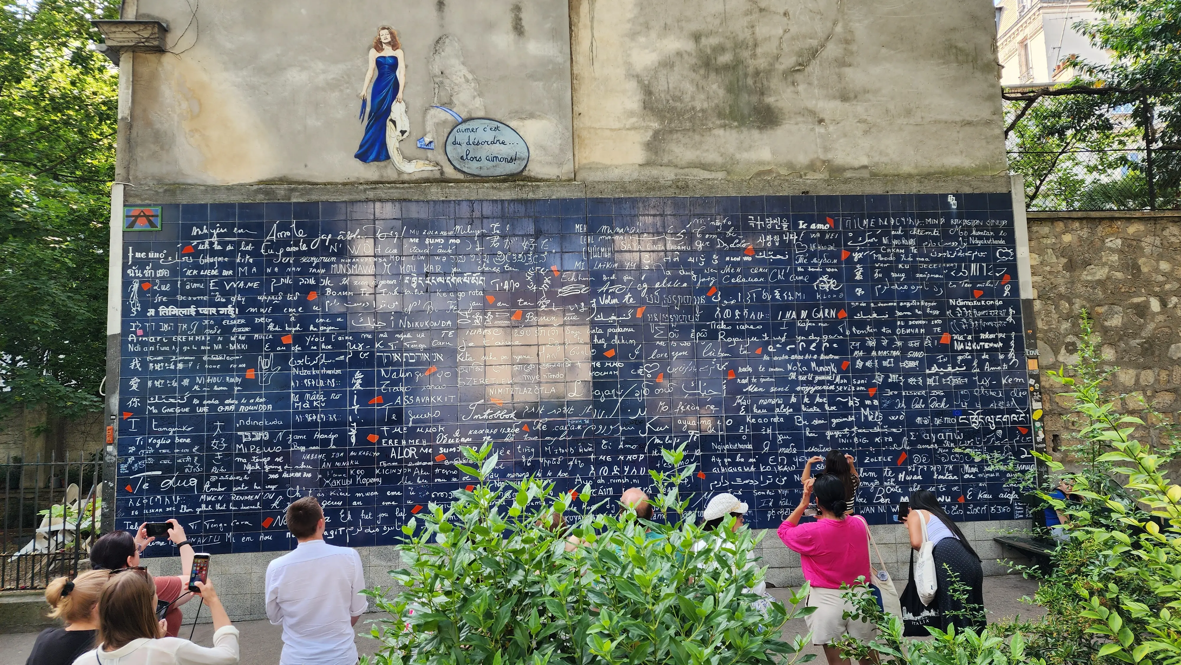 Tucked away in a quiet corner of Square Jehan Rictus, near the Abbesses Metro Station, you’ll find the enchanting Wall of Love (Le Mur des Je T’aime). Created by Frédéric Baron and Claire Kito, this modern artwork is a celebration of love in all its forms. The wall is covered in over 300 translations of “I love you”, written in beautiful calligraphy across deep blue tiles.