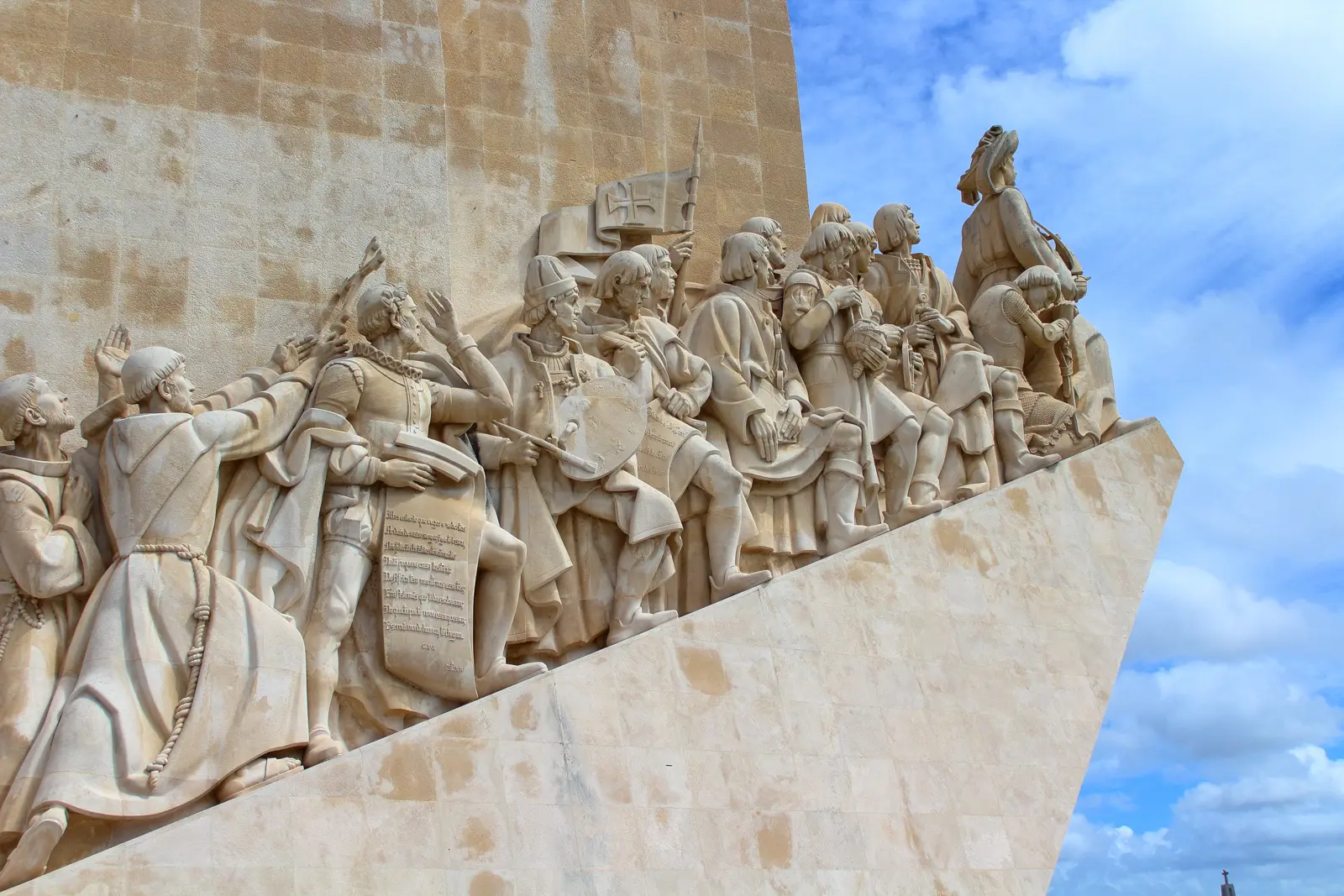Walking along its base, you begin to notice the extraordinary level of detail carved into the limestone. Figures of explorers, writers, missionaries, and navigators cascade down both sides, all angled forward as if propelled by purpose. Henry the Navigator leads the group, holding a model of a caravel, while behind him stand iconic figures such as Vasco da Gama, Ferdinand Magellan, Pedro Álvares Cabral, Bartolomeu Dias, and even Queen Philippa of Lancaster. Each sculpted face and robe feels alive with movement, giving the impression that the entire ensemble could take a step forward at any moment.