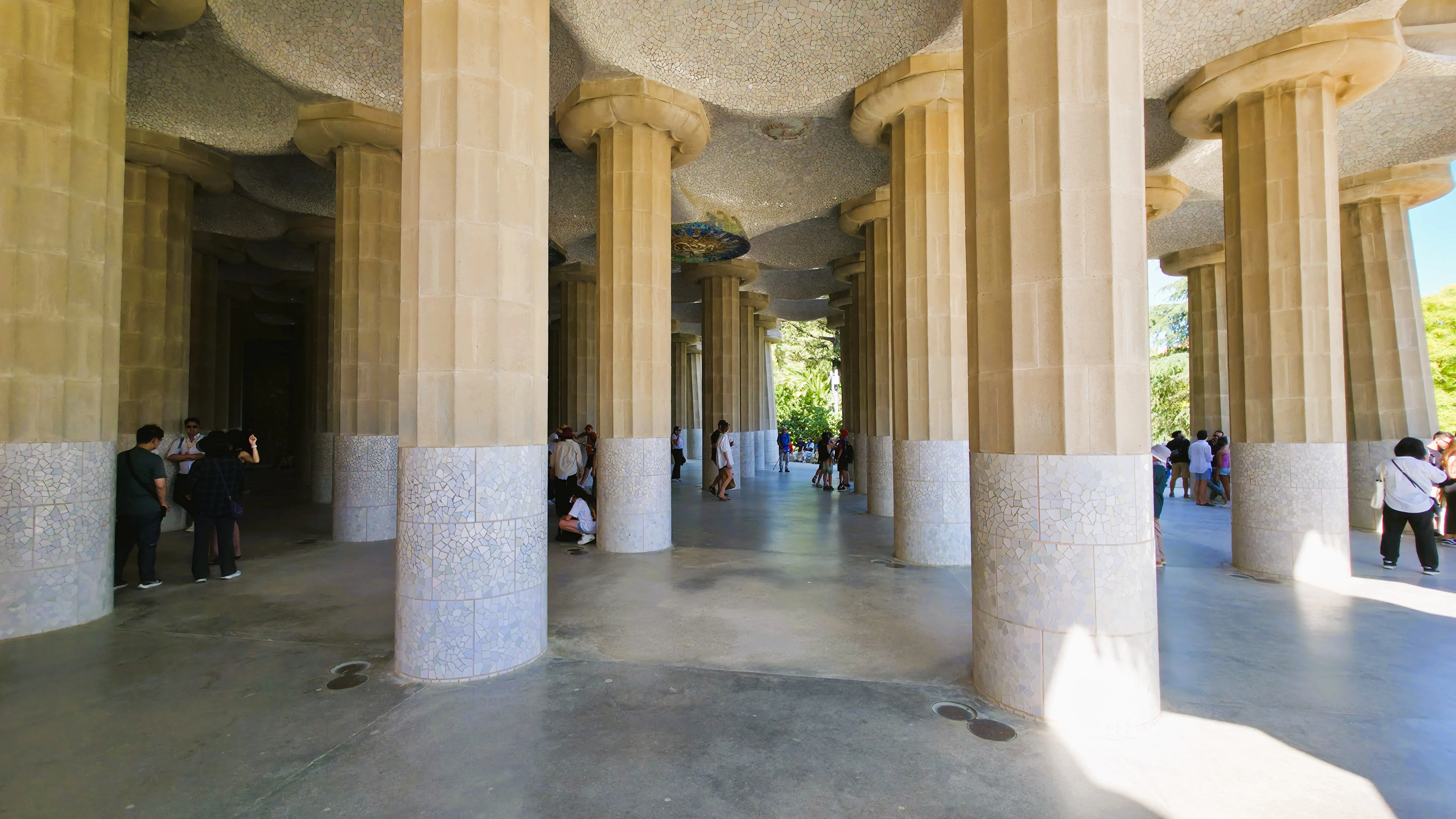Above the stairway lies a forest of 86 Dorically inspired columns. Their white surfaces reflect sunlight, while circular mosaic medallions glow like underwater corals. Originally meant as a market hall, this space also supports the terrace above and channels rainwater through ingenious drainage hidden within the columns, one of Gaudí’s earliest eco-design feats.