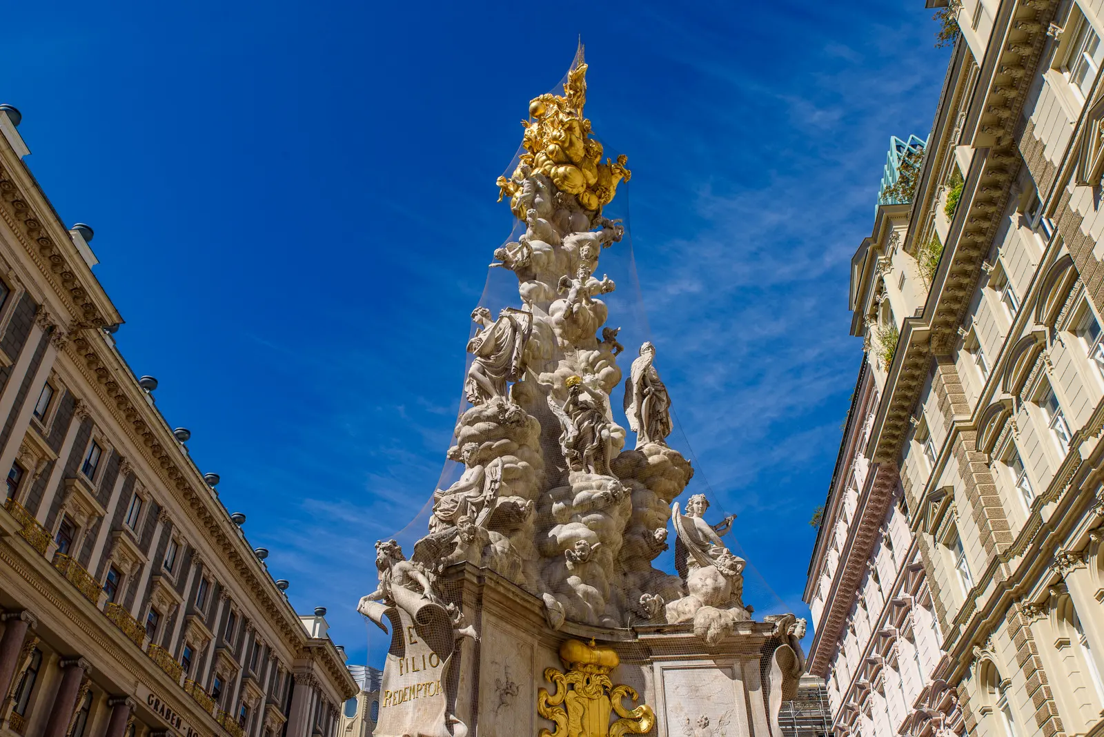 There are landmarks that draw your attention, and then there are those that hold it. Rising from the heart of Graben, the Plague Column is one of Vienna’s most striking and intricate monuments. At first glance, it feels almost theatrical – a cascade of clouds, angels, and sculptural movement spiraling upward into the sky, catching the light and shifting with it throughout the day. It stands at the center of movement and modern life, yet seems to exist within its own space, drawing the eye upward and inward at the same time.