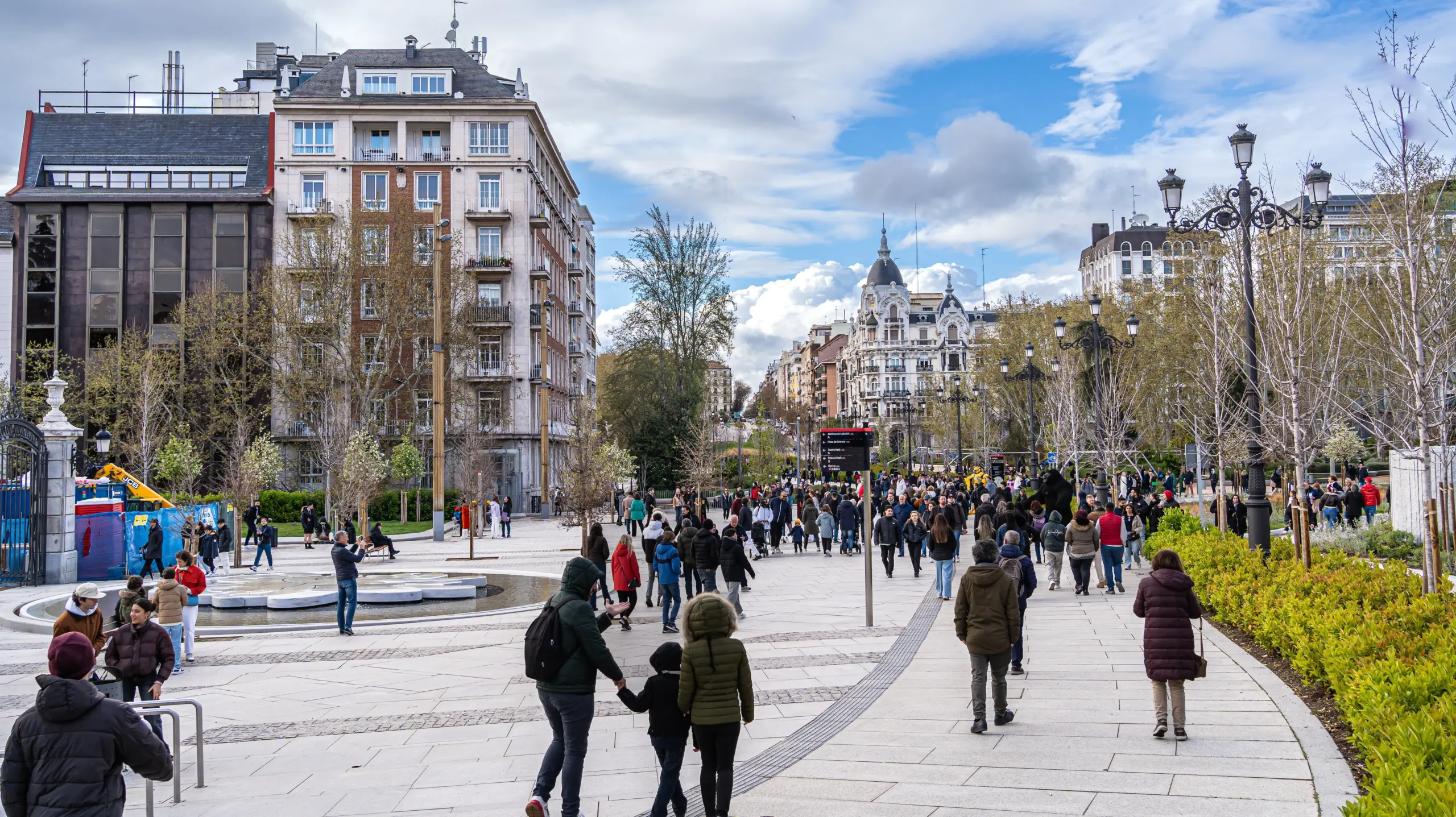 Leafy trees sway gently alongside flowerbeds, children play in interactive zones, locals sip coffee on sun-lit benches, and travelers explore the monuments that give this square its iconic character. Standing here, you feel how thoughtfully the city blends innovation with heritage – a modern plaza that still honors Madrid’s classic charm.