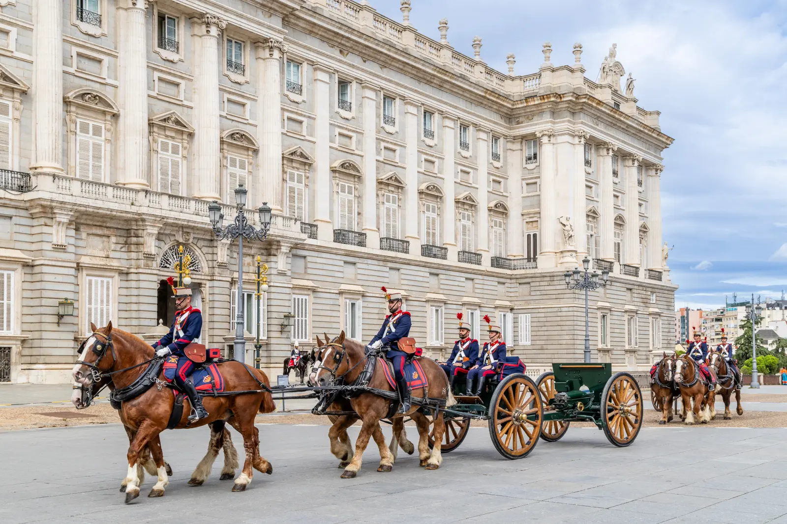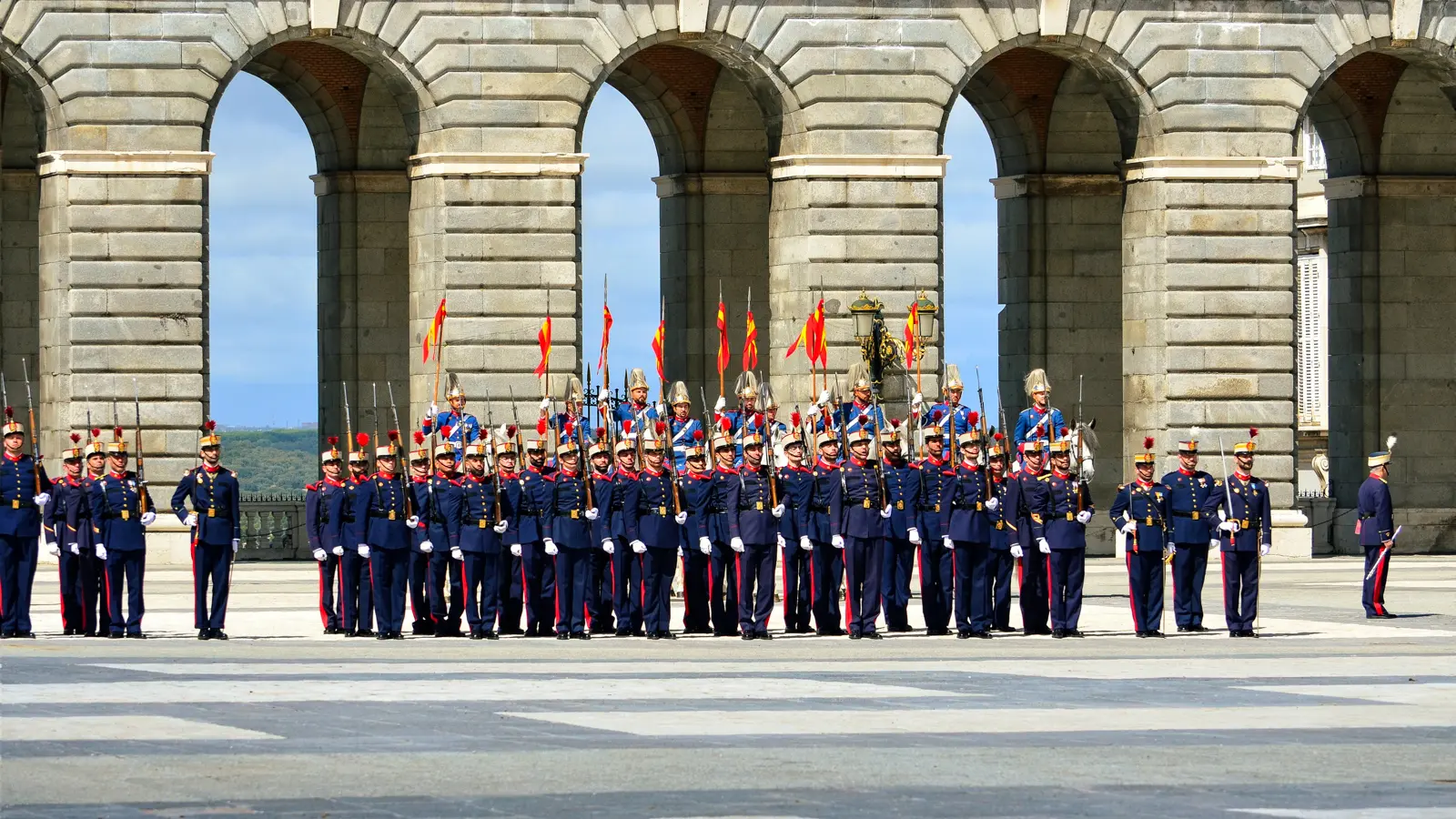 Turn toward the Royal Palace, and the full splendor of its Baroque-Neoclassical façade stands before you. The architecture is grand without being overwhelming: rhythmic pilasters, stately Ionic columns on Tuscan bases, symmetrical balconies, and a façade of gleaming white limestone and granite that changes tone with the light. This is the side through which kings once rode into ceremonies or processions. Today, Plaza de la Armería remains the backdrop for the Changing of the Royal Guard, held on Wednesdays and Saturdays, a tradition that brings history to life in the middle of the city.