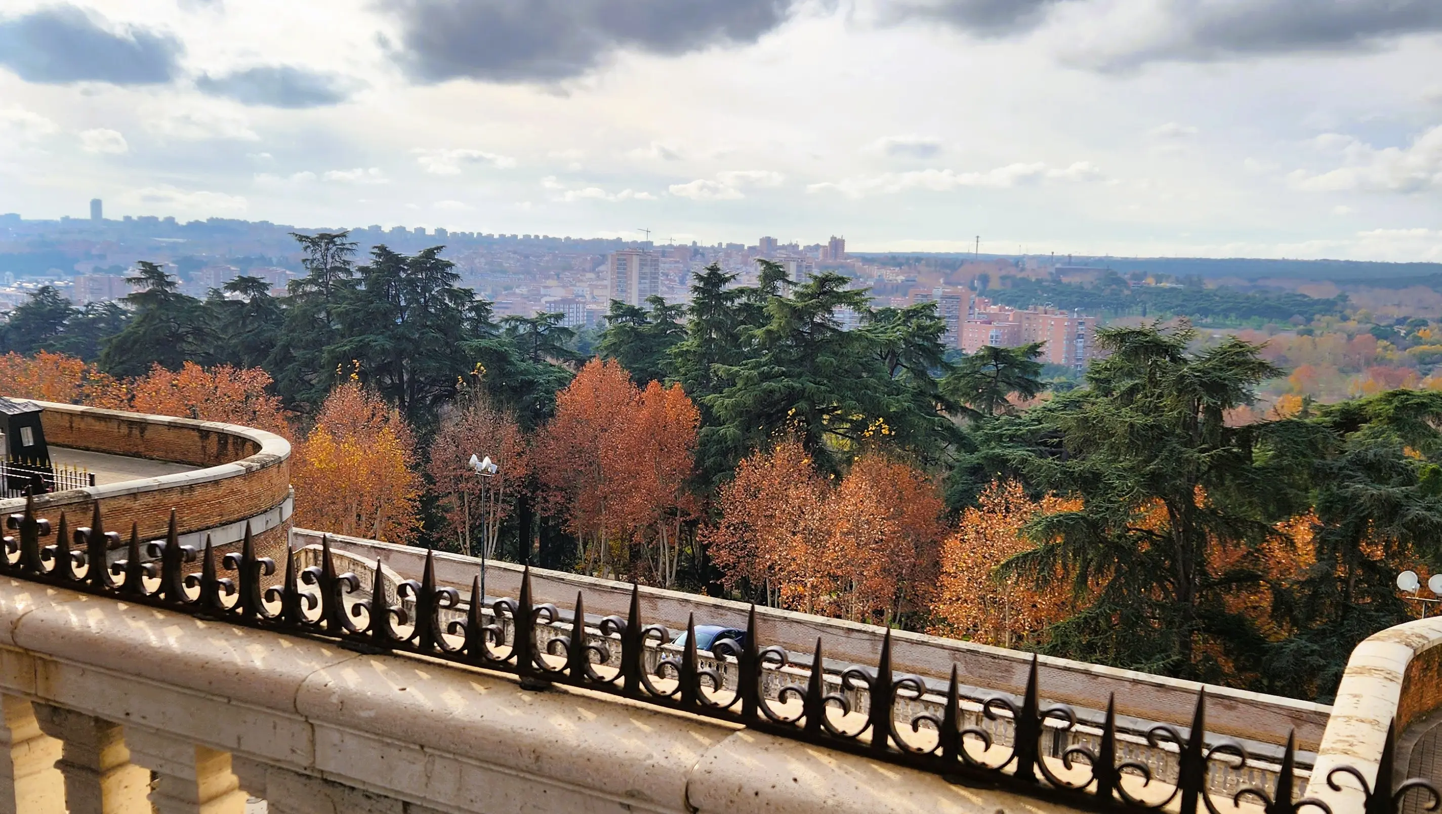 On my visit, I watched visitors pose for photos, artists sketching the dome, and families sitting along the stone ledges taking in the beauty around them. It’s an easy place to linger – wide, breezy, and perfectly designed for admiring Madrid’s most iconic structures. As I looked beyond the balustrades toward Campo del Moro, the gardens were glowing in soft afternoon light, their rich greens, deep shadows, and pops of seasonal color creating a stunning natural frame beneath the palace. The contrast between the ornate stonework of the plaza and the lush foliage below made the entire scene feel even more majestic.