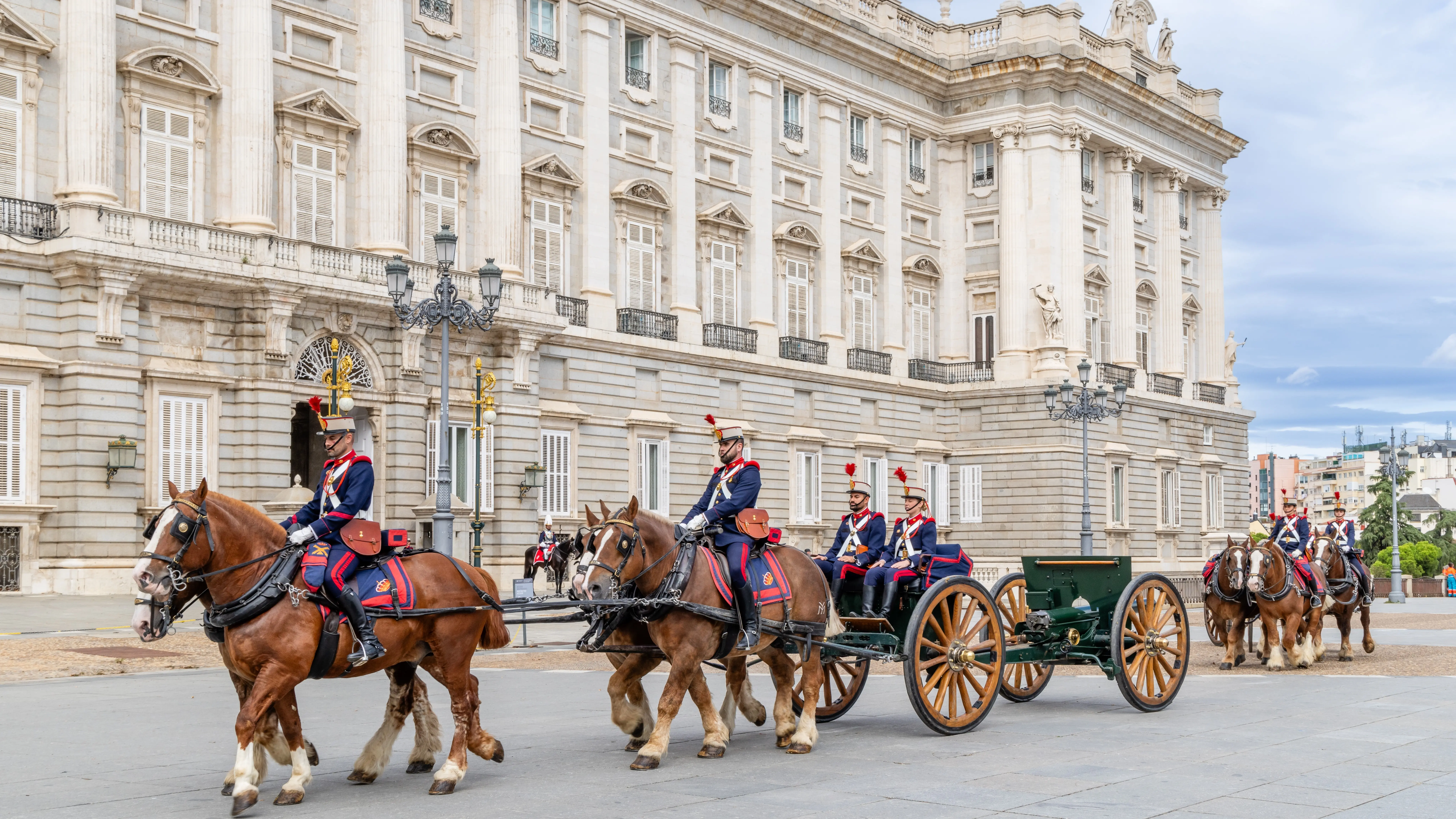 Turn toward the Royal Palace, and the full splendor of its Baroque-Neoclassical façade stands before you. The architecture is grand without being overwhelming: rhythmic pilasters, stately Ionic columns on Tuscan bases, symmetrical balconies, and a façade of gleaming white limestone and granite that changes tone with the light. This is the side through which kings once rode into ceremonies or processions. Today, Plaza de la Armería remains the backdrop for the Changing of the Royal Guard, held on Wednesdays and Saturdays, a tradition that brings history to life in the middle of the city.