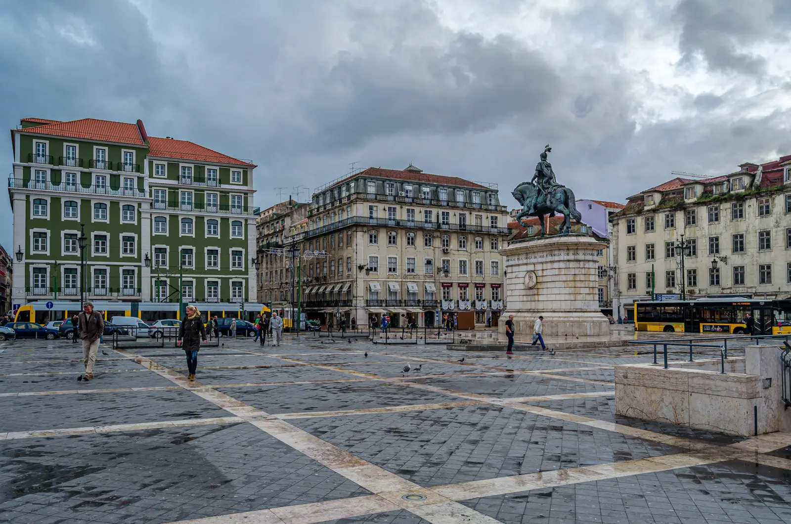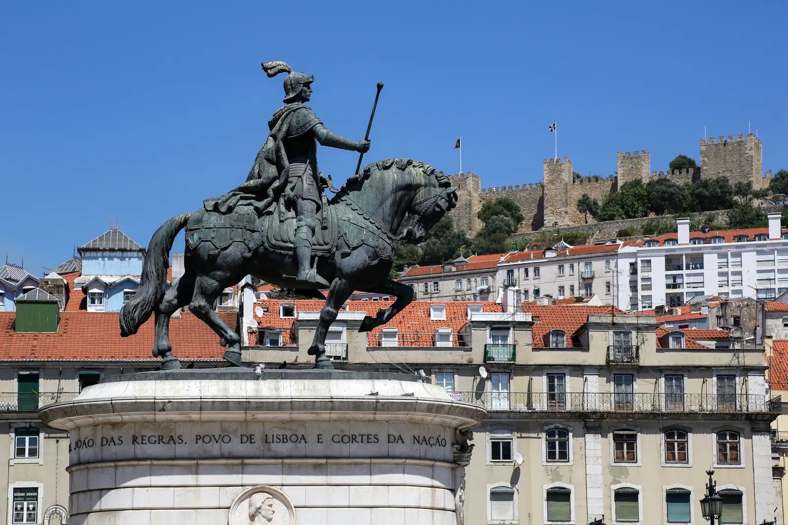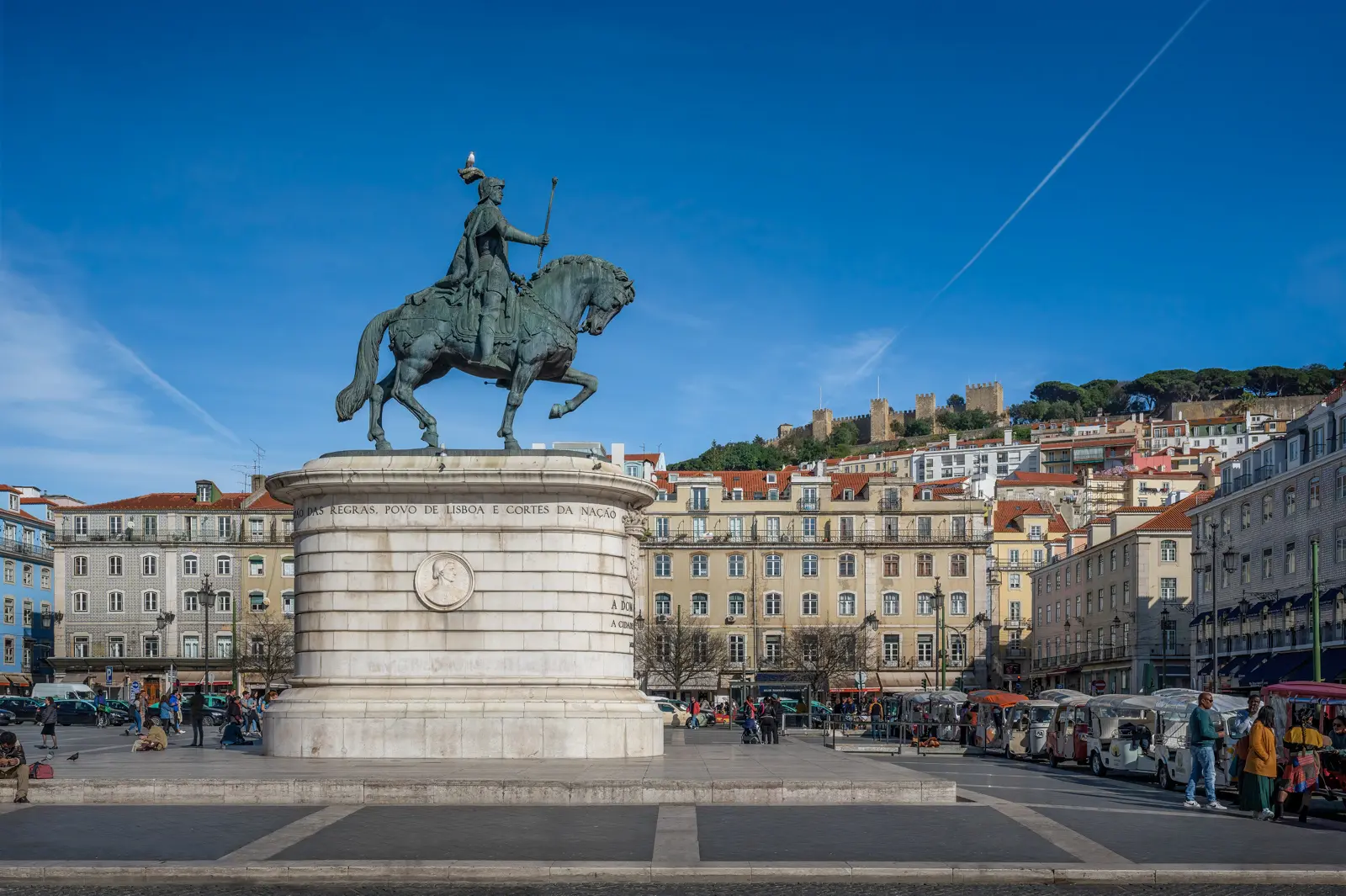 At the center of the square stands the bronze equestrian statue of King João I, created by sculptor Leopoldo de Almeida and inaugurated in 1971. João I, founder of the Avis Dynasty, is remembered for restoring stability after the 1383-1385 crisis and for setting the stage for Portugal’s early maritime ventures. His presence anchors the square with a sense of continuity, subtly evoking Lisbon’s long relationship with the sea, commerce, and exploration.