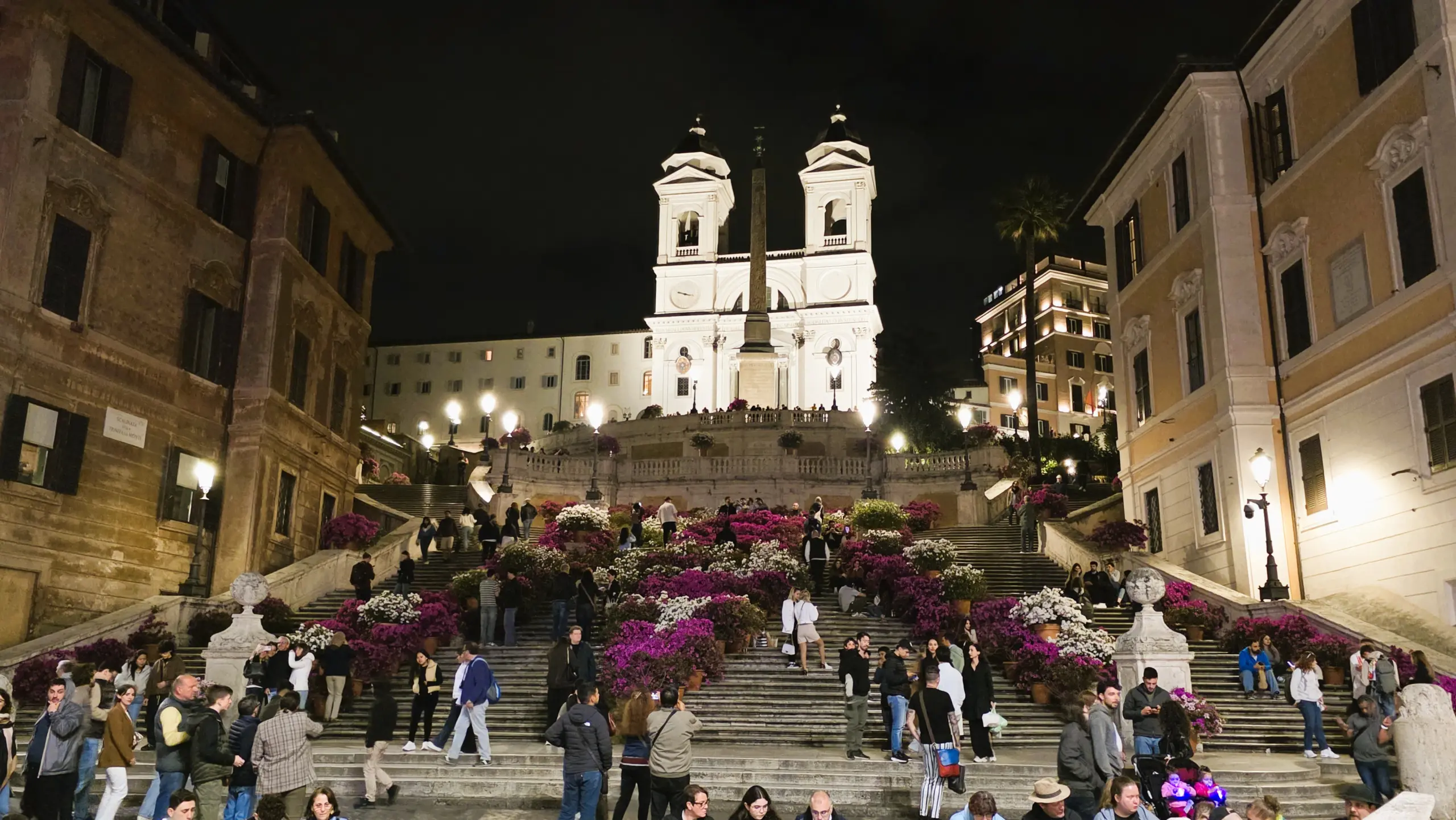 In the evening, Rome transforms. The Spanish Steps glow softly under lamplight, and the surrounding streets feel elegant and alive, with well-dressed Romans strolling, photographers lingering, and cafés buzzing nearby. Looking back over Piazza di Spagna at night, the city feels timeless, poised between history and modern life.