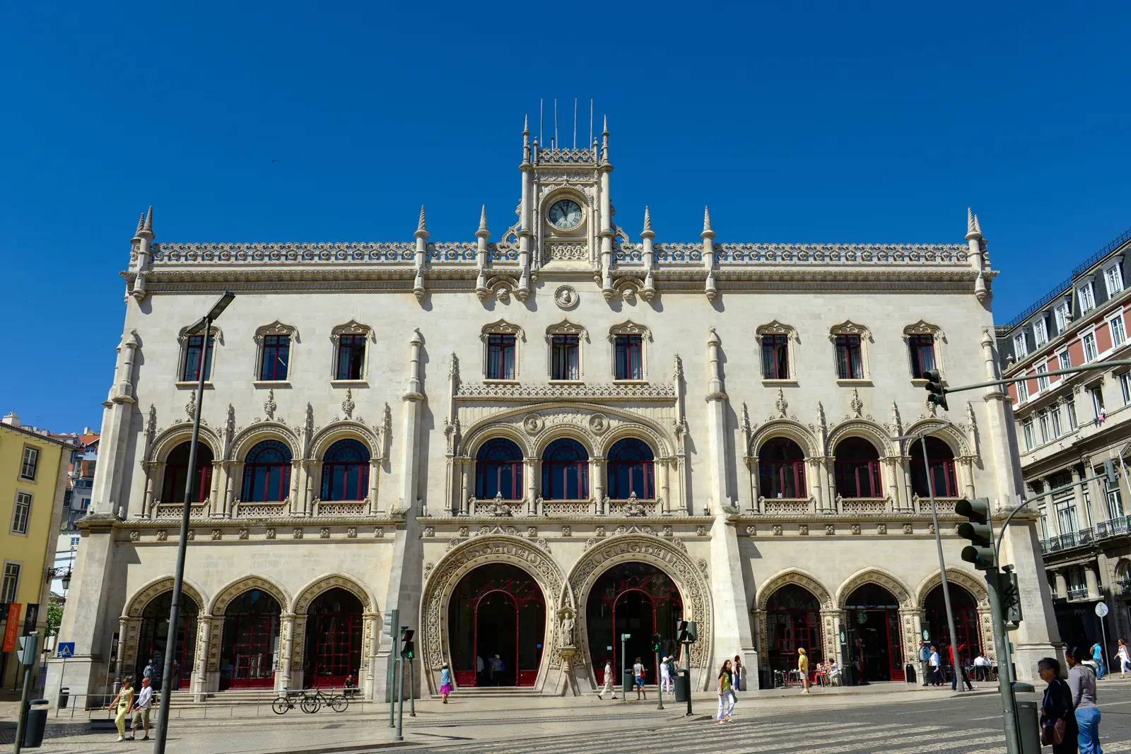 The exterior is a showstopper. Two enormous horseshoe-shaped arches frame the entrance, their intricate stonework curling like ocean waves. Above them, delicate windows, carved rope motifs, and ornamental details rise toward a central clock that has watched over Rossio Square for more than a century. The design celebrates Portugal’s maritime past, but with a romantic, almost fairytale touch. Standing before it feels like stepping into a royal gateway – elegant, proud, and unmistakably Portuguese.