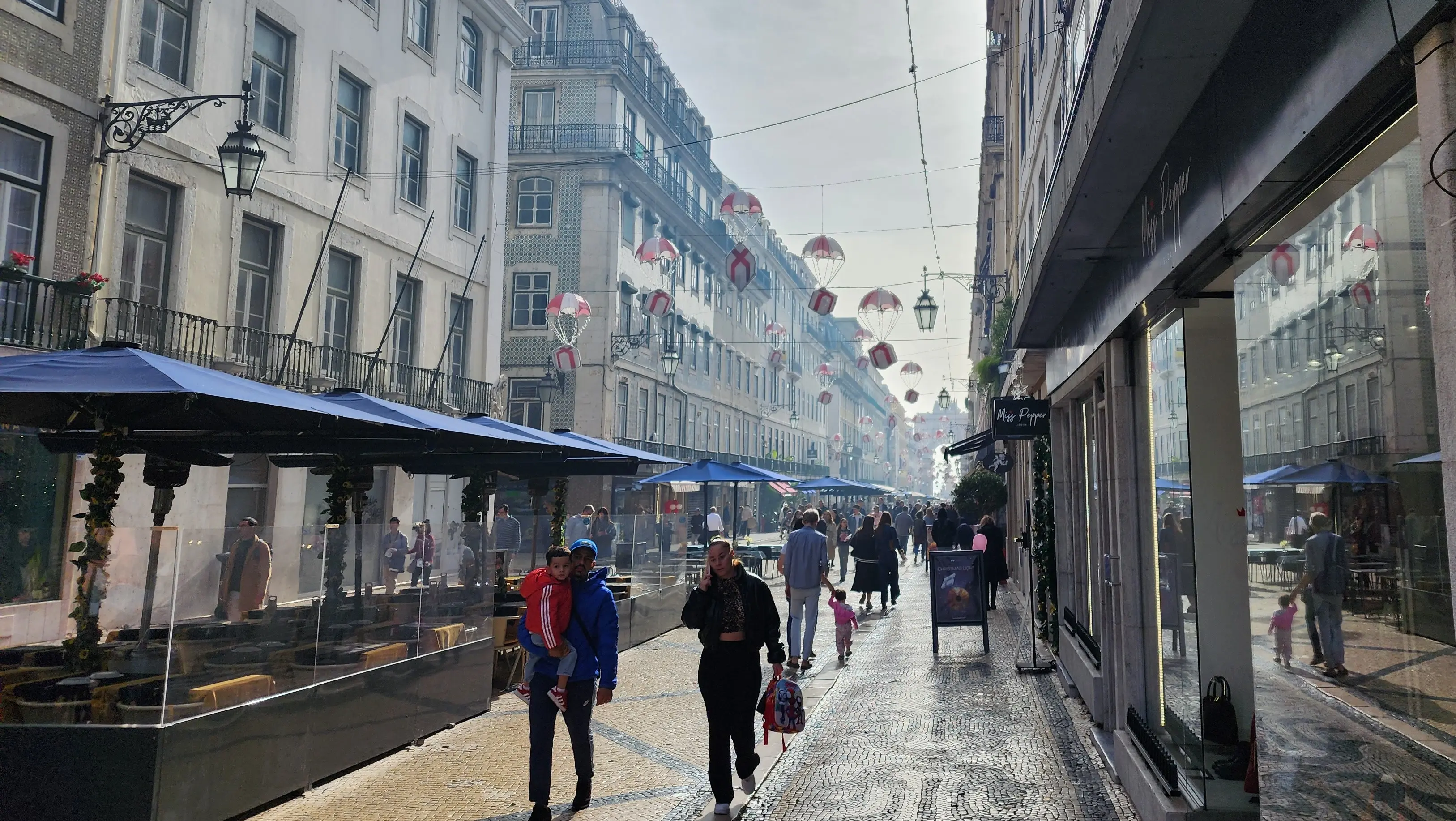 From the moment you step onto Rua Augusta, you’re greeted by Lisbon’s famous calçada portuguesa—mosaic pavements so detailed they turn every stroll into a gallery walk. One musician played a haunting fado melody near a bookshop, while just a few steps later, samba dancers brought rhythm to the cobblestones. I passed a flower seller beside a pastelaria, its windows fogged with buttery warmth. Nearby, a café with a retro espresso machine hissed softly as locals lingered over coffee beneath the holiday lights.