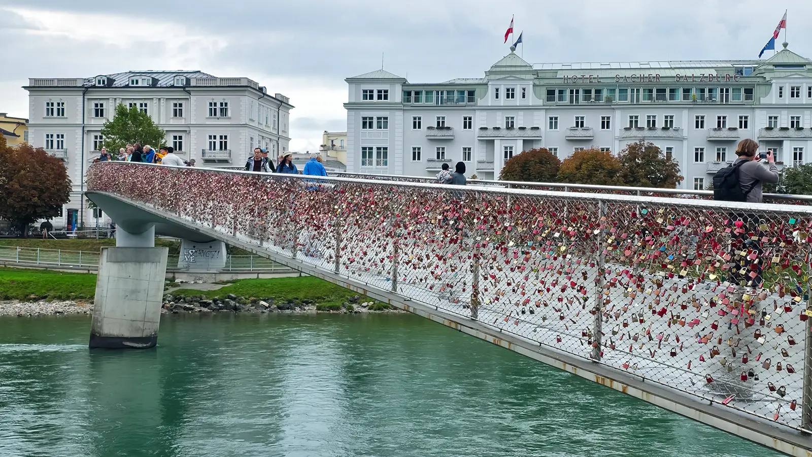 💕 Makartsteg (Marko-Feingold-Steg) · The current steel span opened in 2001 and is the third iteration on the site. The love-lock tradition took hold around 2011. Officially renamed in 2019 after Austria’s oldest Holocaust survivor.
