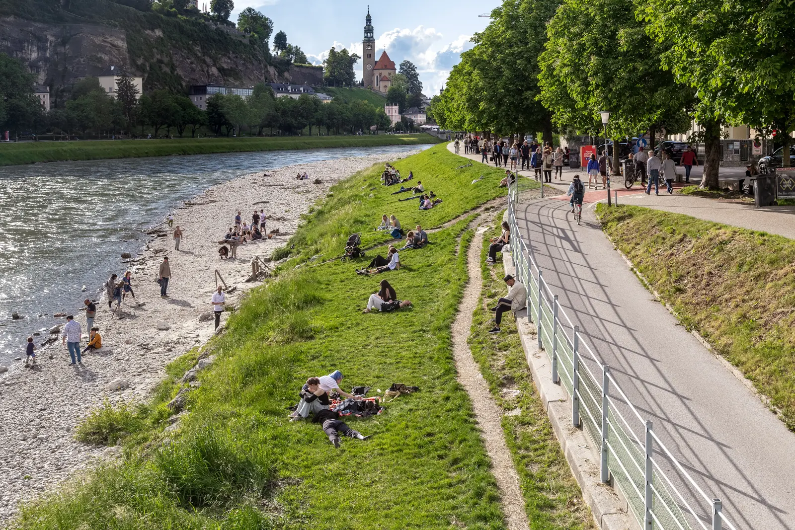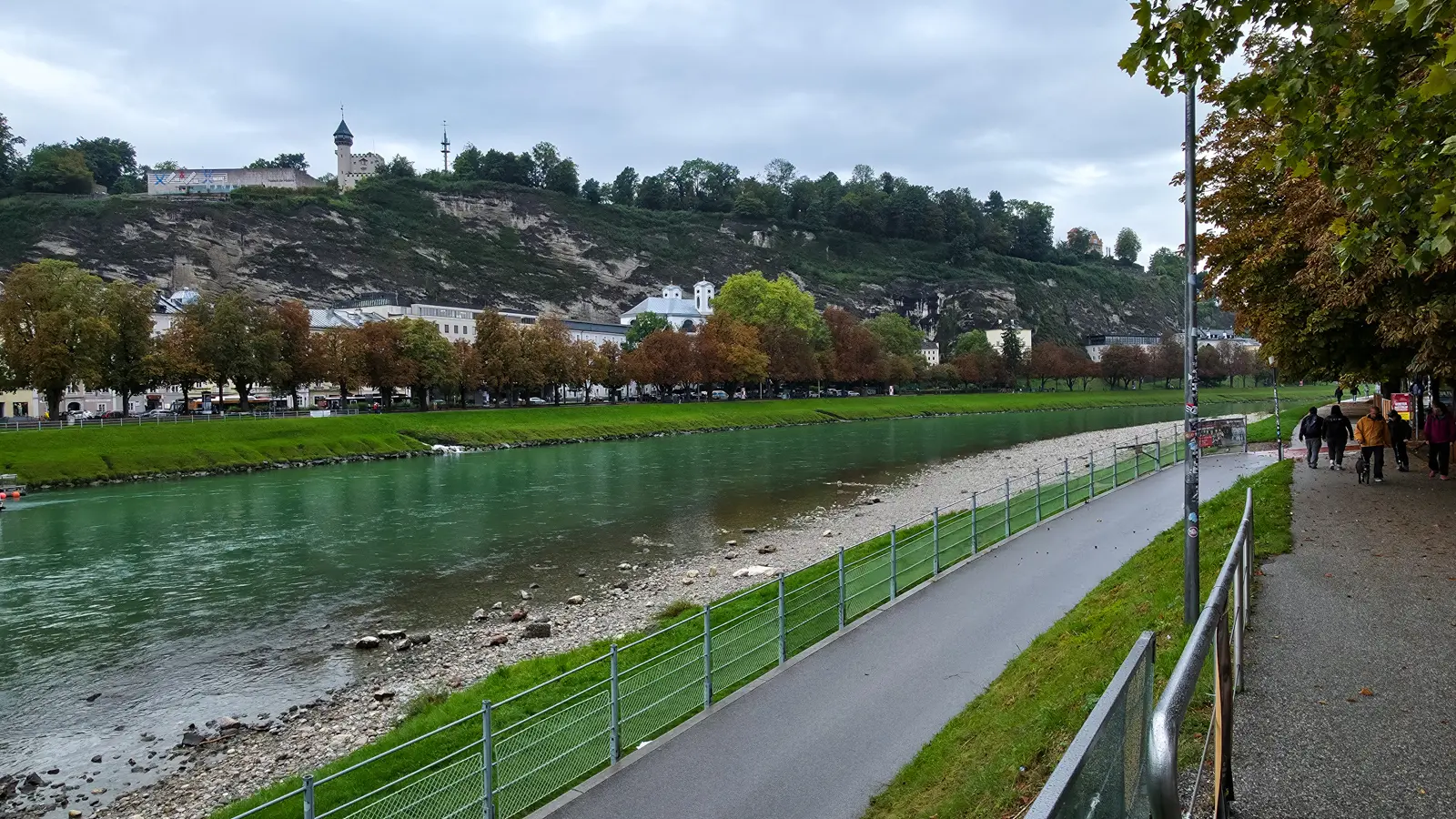 🚶 Riverside path · The left-bank and right-bank paths form part of the 327 km Tauernradweg cycle route from Krimml to Passau — Salzburg’s stretch is equally pleasant on foot.