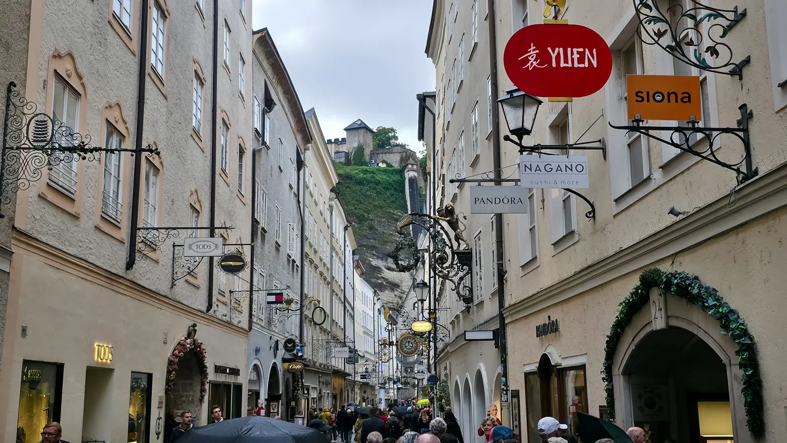 🛍️ Getreidegasse · Historic main street with wrought-iron guild signs and hidden courtyards.