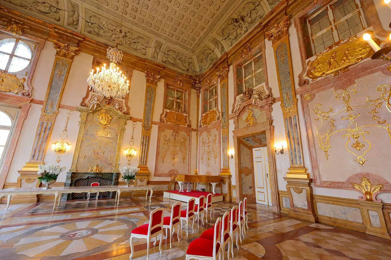 The palace itself is equally worth noting. Its Marble Hall (Marmorsaal) is considered one of the finest Baroque interiors in Salzburg, a space known for its elegance, proportions, and historical significance. The hall we see today dates to the 1721–1727 rebuild under Prince-Archbishop Franz Anton von Harrach, designed by Johann Lukas von Hildebrandt (the same architect who gave Vienna its Belvedere Palace). A young Wolfgang Amadeus Mozart and his sister Nannerl performed here as children, and Mozart’s music is still played here regularly today. Leading up to it is the Angels’ Staircase (Engelsstiege), designed by Hildebrandt and decorated in 1726 with marble putti by the sculptor Georg Raphael Donner. Locals often call it the Donnerstiege, a pun on Donner’s name and the German word for thunder. Even if you aren’t attending a concert, the staircase is worth the short detour.