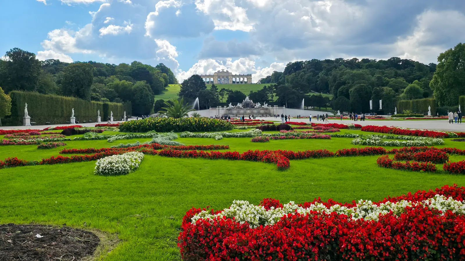 🌸 Key Features: Great Parterre (formal flowerbeds), Neptune Fountain (1776, mythological Baroque sculpture), Gloriette (1775, hilltop monument + café + panoramic view), Roman Ruin (1778, romantic folly)