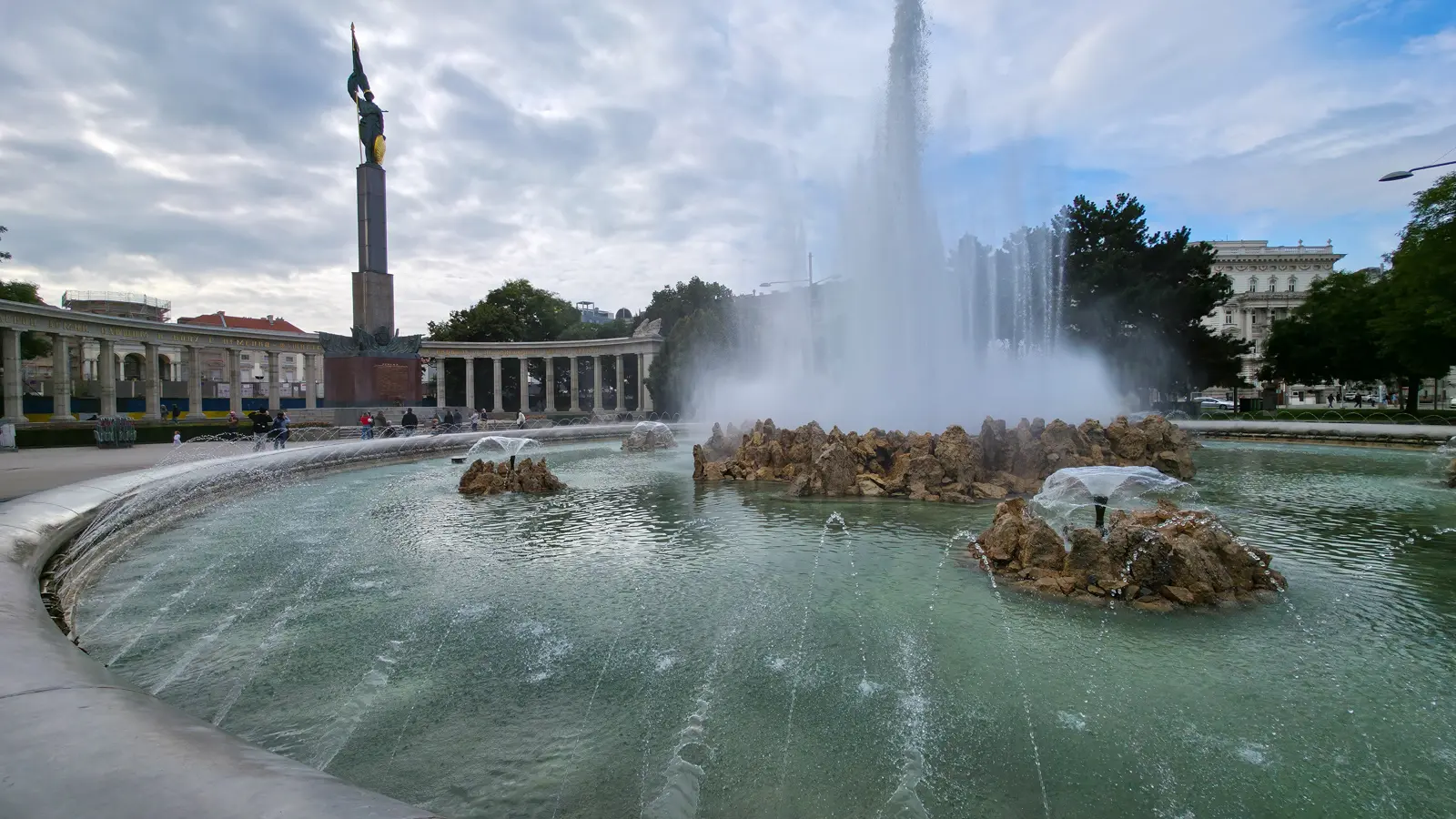 At the opposite end of Schwarzenbergplatz, the Soviet War Memorial introduces a very different kind of presence, one shaped by the aftermath of World War II. Unveiled on August 19, 1945, the memorial commemorates the approximately 17,000 Red Army soldiers who lost their lives during the Battle of Vienna in April of that year. Its form is monumental: a central obelisk rising over 20 metres, flanked by a semicircular white marble colonnade, with a forward statue of a Red Army soldier bearing a laurel wreath and banner, a composition that conveys permanence and gravity in equal measure.