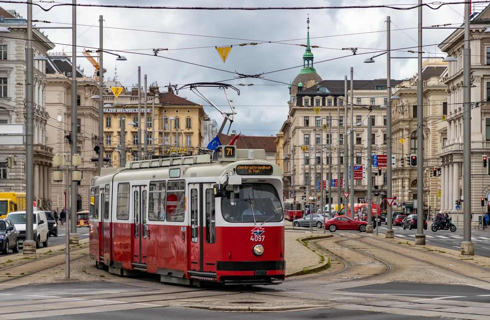 It is worth being honest about the square’s present character. Tram rails and busy roads intersect the space, effectively dividing it into a series of traffic islands that can make it feel less cohesive than its scale suggests. And yet, despite this, the underlying spatial ambition remains legible. The alignment of monuments, fountains, and architecture still creates a sense of composition, a feeling that this space was designed with intention, even if the traffic has complicated the experience.